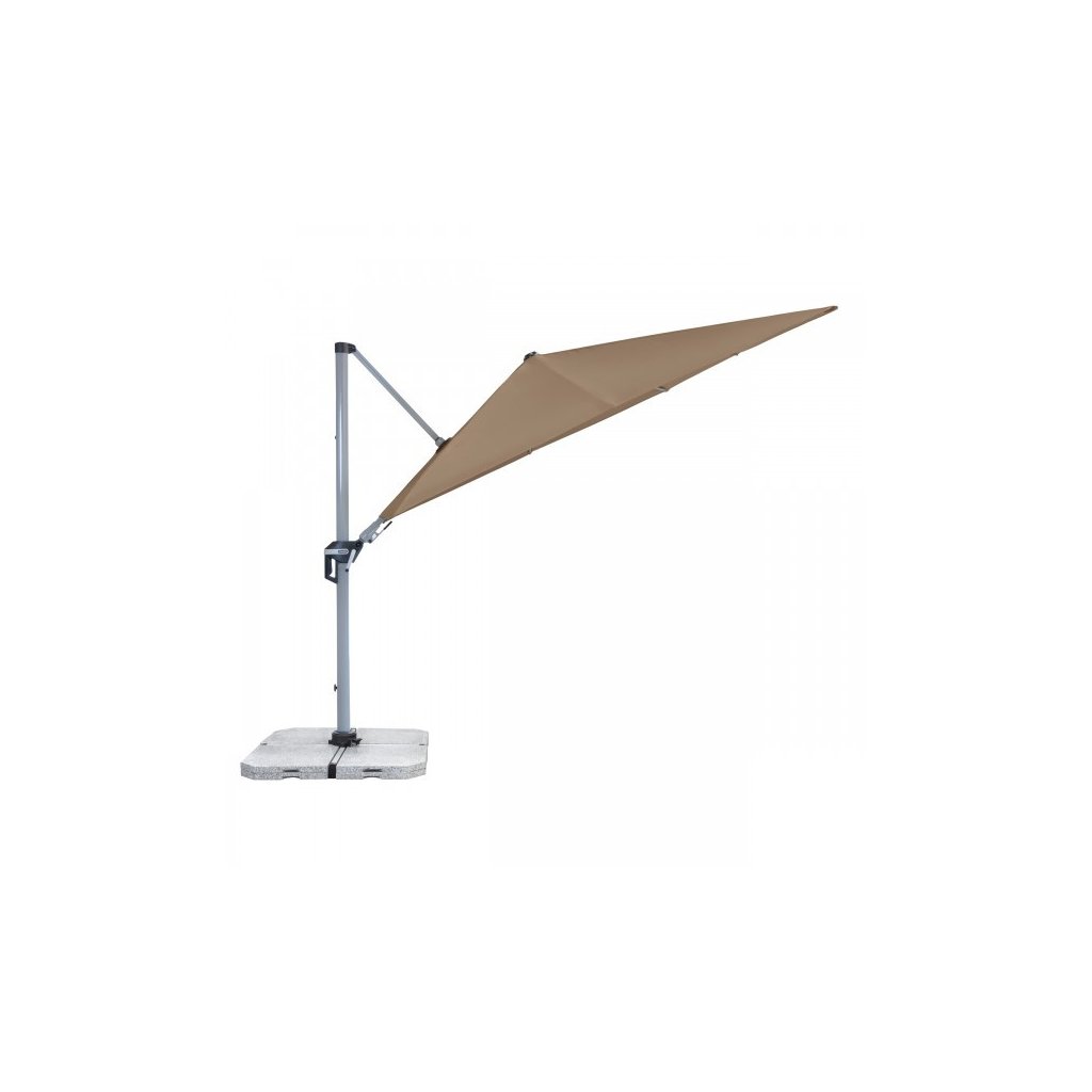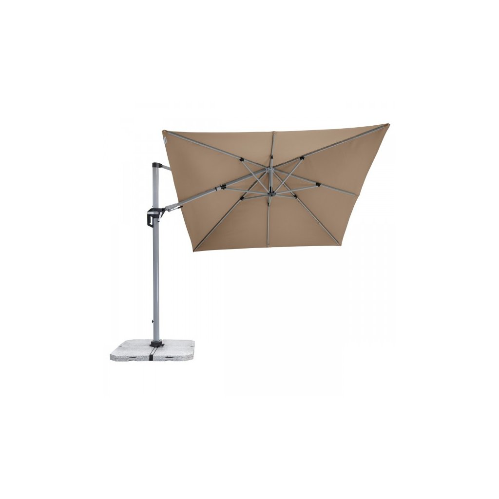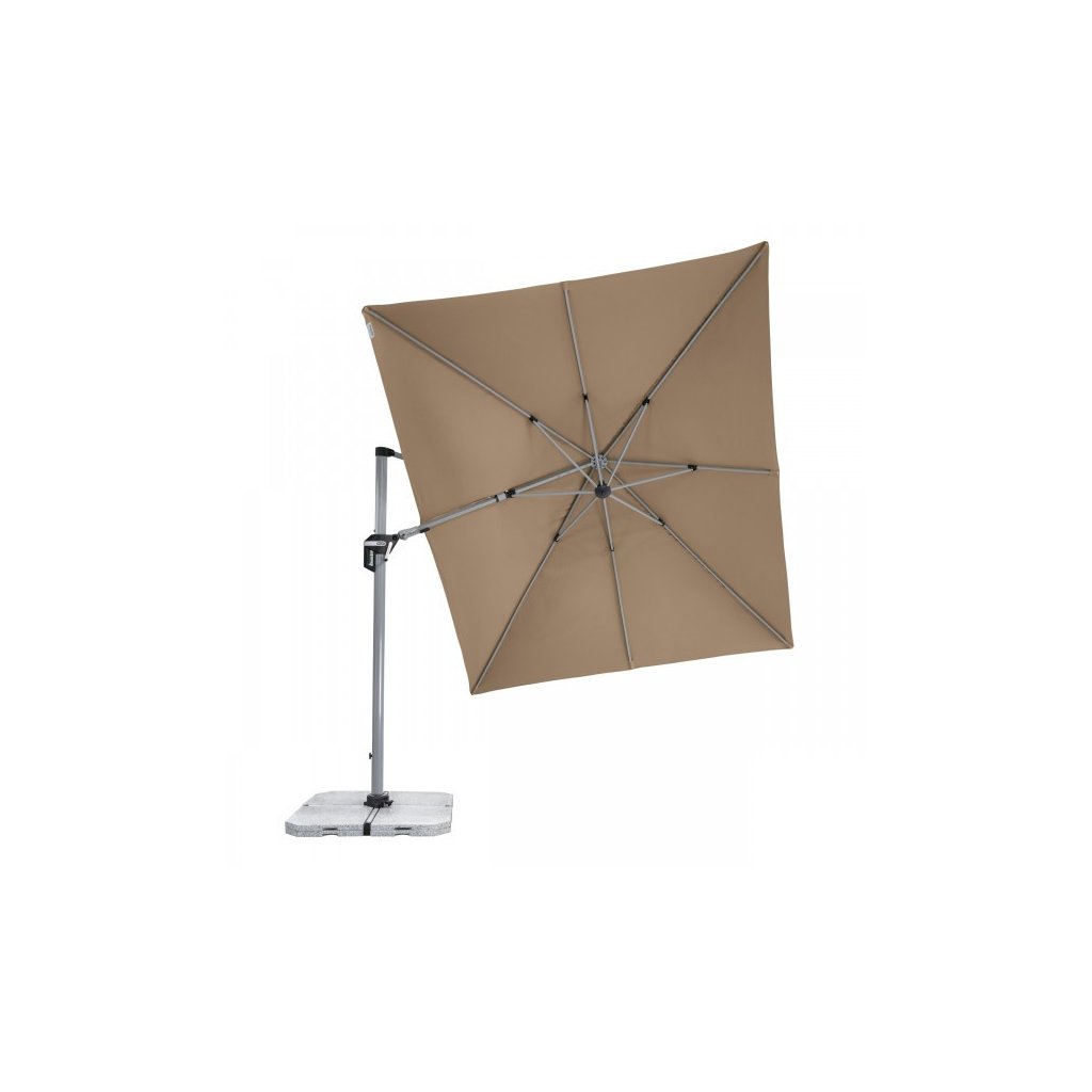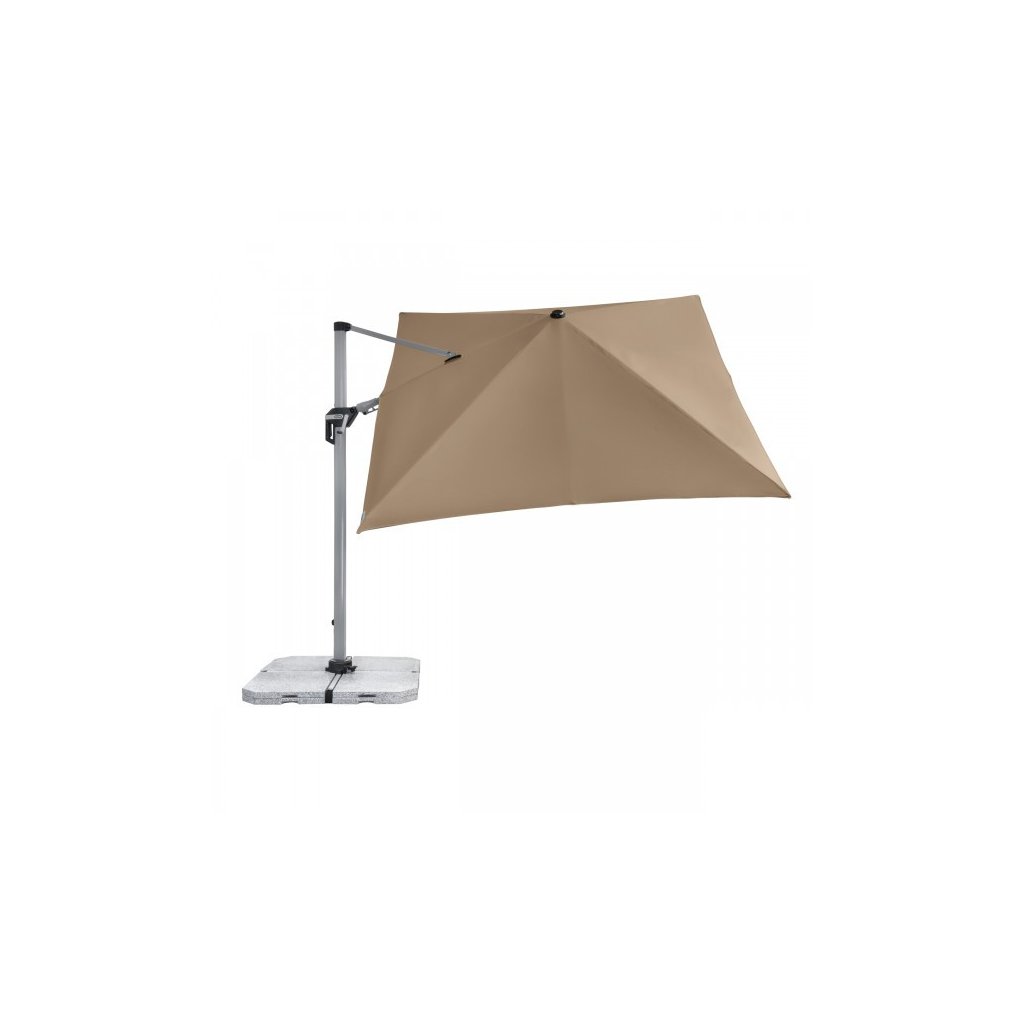 Active 350 x 260 cm je velice všestranný a vysoce kvalitní slunečník s pevným hliníkovým rámem. Obdélníkový tvar střechy je obzvláště vhodný pro zastínění zahradního nábytku. Kromě toho se slunečník dá přizpůsobit pohybu slunce během dne, protože je možné jej otočit o 360°, natočit axiálně na obě strany a může být nastaven pod úhlem dozadu, čímž se optimálně přizpůsobuje pohybu slunce. Potah je vyroben z polyesterové tkaniny odpuzující vodu s dobrou UV ochranou 50+.