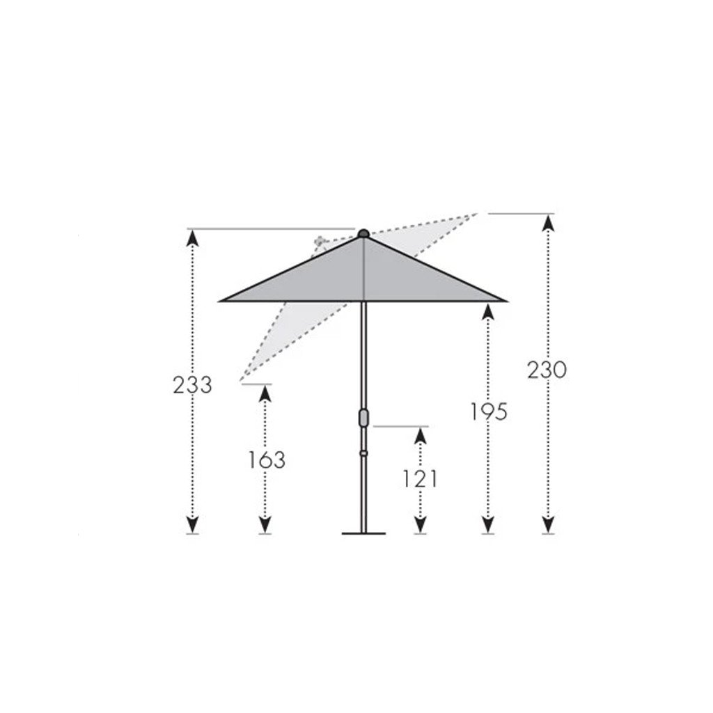 | Vlastnosti a funkce: | Odolný povětrnostním vlivům, Výškově nastavitelný, Otočný kolem osy, Naklápěcí, Snímatelný/ručně pratelný potah slunečníku, Automatické otevírání klikou |