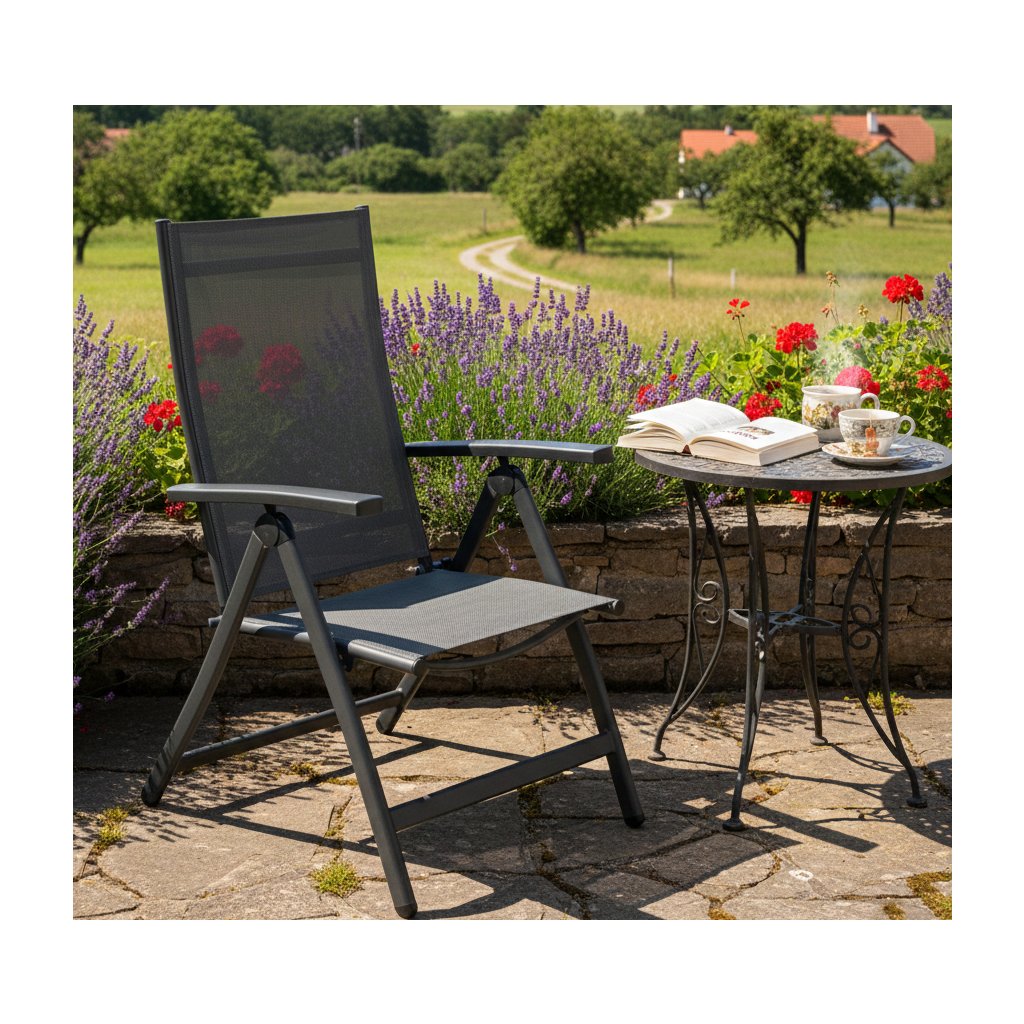 Polohovací zahradní křeslo ACTIVE káro je vyrobeno z bezúdržbových materiálů. Pevná hliníková konstrukce v antracitové barvě je doplněna výpletem z kvalitní umělé textilie v barvě stříbrné káro.