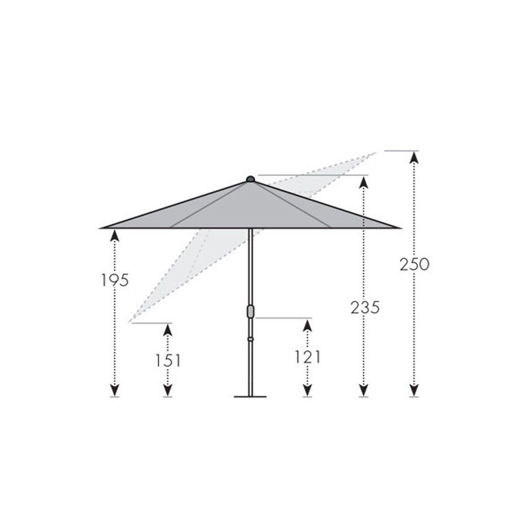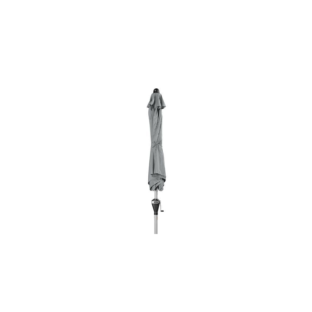 Slunečník má stabilní hliníkovou konstrukci, která je vybavená klikou pro snadné otevírání a zavírání. Komfortní funkce automatického naklápění umožňuje automatické naklopení střechy pouhým otočením kliky. Slunečník je možné výškově nastavit o 15 cm. Potah slunečníku je vyroben ze 100% polyesterové tkaniny odolné proti povětrnostním vlivům s dobrou světelnou stálostí a dobrou UV ochranou 50+ SPF. Díky vzduchovému ventilu ve střeše se pod slunečníkem nekumuluje horký letní vzduch.