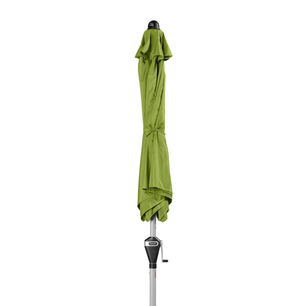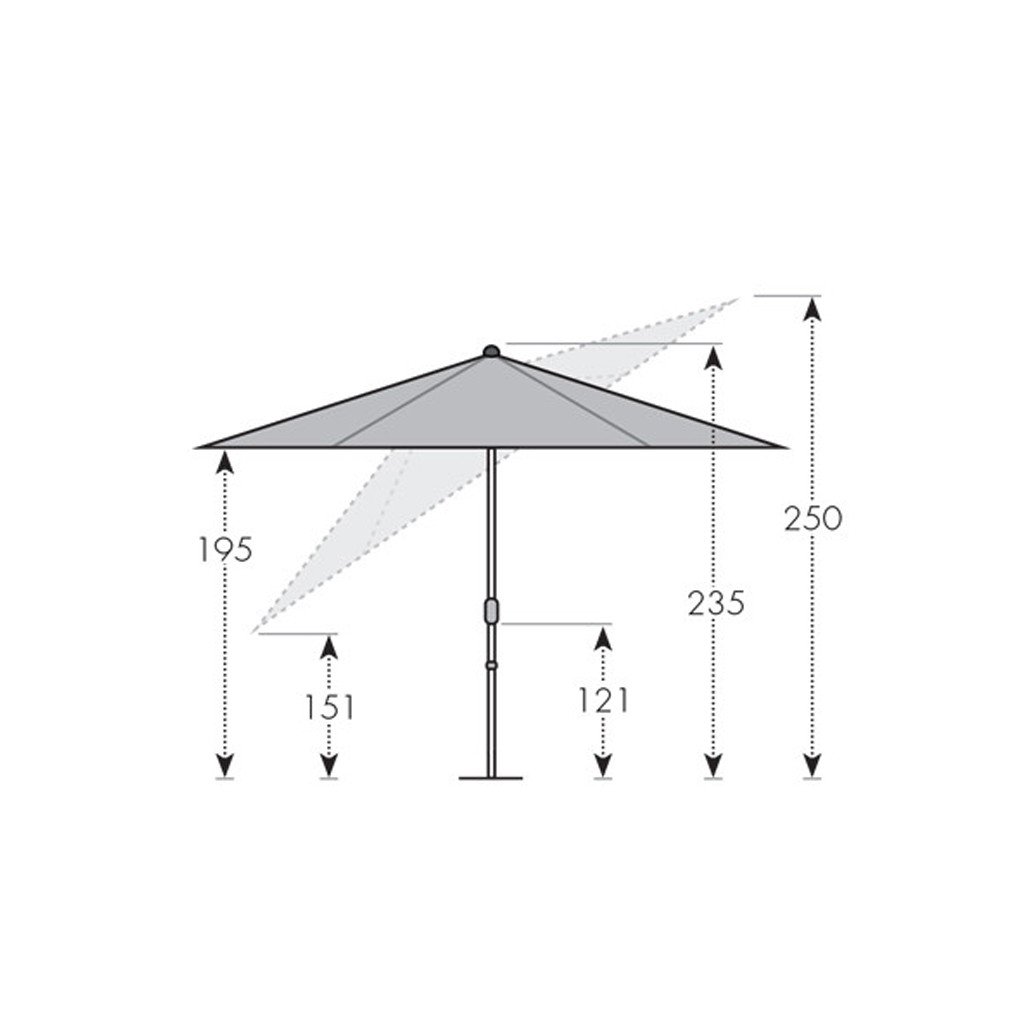 Slunečník má stabilní hliníkovou konstrukci, která je vybavená klikou pro snadné otevírání a zavírání. Komfortní funkce automatického naklápění umožňuje automatické naklopení střechy pouhým otočením kliky. Slunečník je možné výškově nastavit o 15 cm. Potah slunečníku je vyroben ze 100% polyesterové tkaniny odolné proti povětrnostním vlivům s dobrou světelnou stálostí a dobrou UV ochranou 50+ SPF. Díky vzduchovému ventilu ve střeše se pod slunečníkem nekumuluje horký letní vzduch.