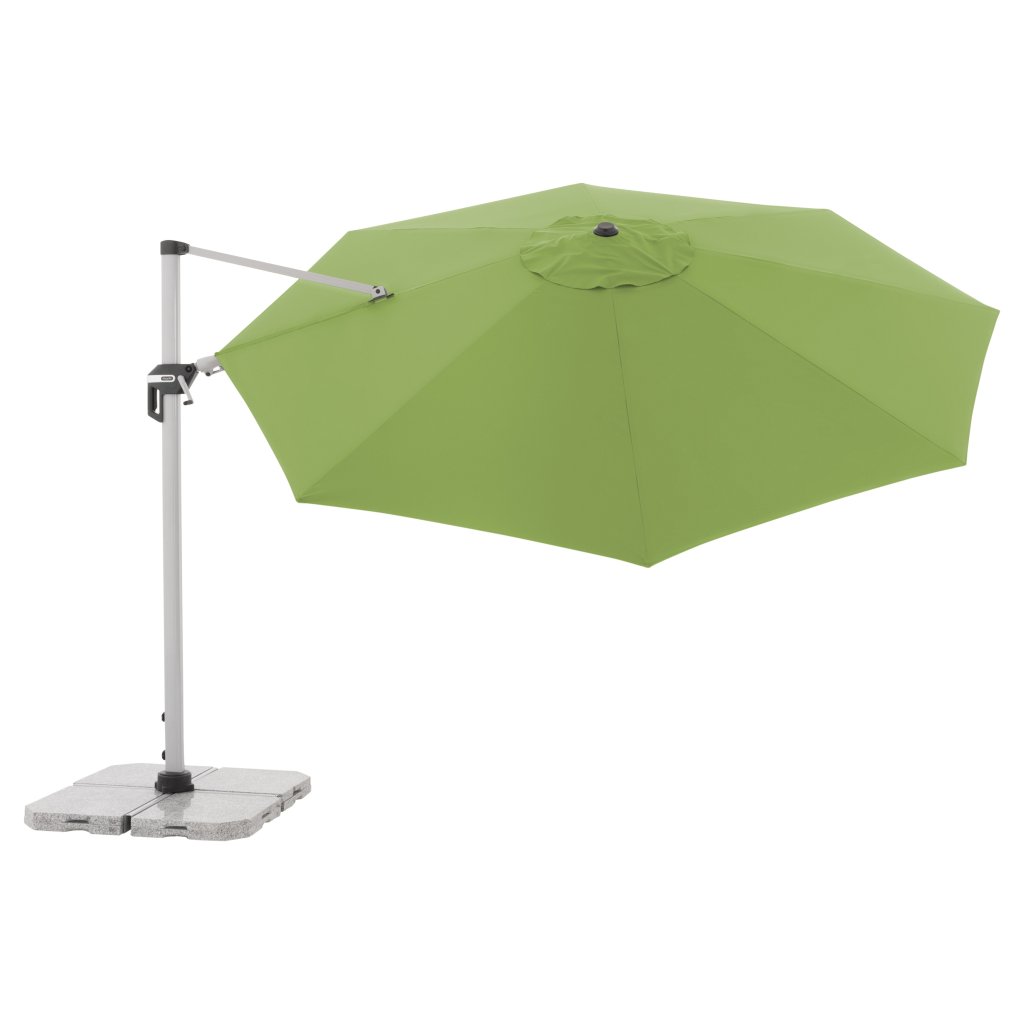 Vysoce kvalitní slunečník Active s boční nohou je s průměrem střechy 370 cm a gigantickou střechou (více než 10m2) obzvlášt vhodný pro zastínění zahradního posezení a zahradního nábytku. Při letním slunci vám pak zaručí maximum pohodlí a ochranu proti UV záření. Je také velmi stabilní díky pevnému, masivnímu hliníkovému rámu. Kromě toho se slunečník dá jednoduše přizpůsobit pohybu slunce během dne, dá se otočit až o 360°, naklopit pod žádaným úhlem na všechny strany. Slunečník je včetně základního kříže (bez dlaždic). Potah je vyroben z 100 % polyesteru odpuzujícího vodu s dobrou UV ochranou 50+. Díky ventilačnímu otvoru ve střeše se pod slunečníkem nekumuluje horký letní vzduch.