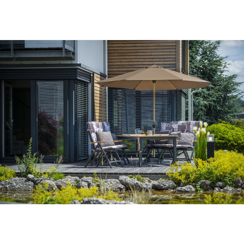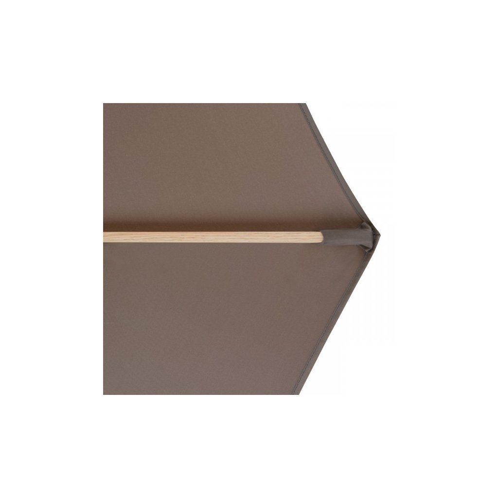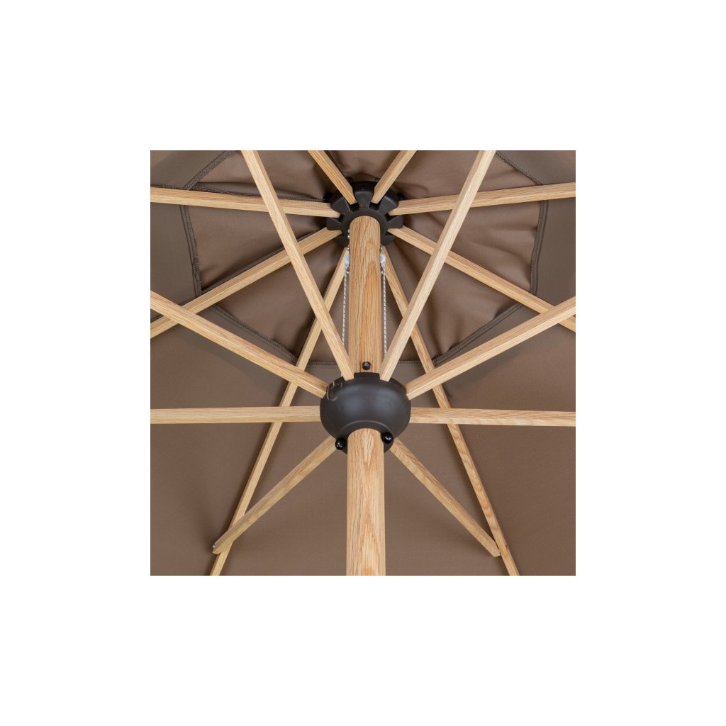 Tento slunečník udělá radost milovníkům dřeva. Díky nadčasovému vzhledu v imitaci jasanového dřeva a potahům v teplých přírodních barvách se hodí téměř na každý balkón, terasu nebo zahradu. Slunečník je vybaven kličkou, která umožňuje pohodlné otevírání a zavírání. Rám je vyrobený z vysoce kvalitního hliníku a vzpěry z oceli, což mu dodává dlouhou životnost. Potah má vynikající ochranu proti UV záření 80+. Díky ventilačnímu otvoru ve střeše se pod slunečníkem nekumuluje horký letní vzduch.