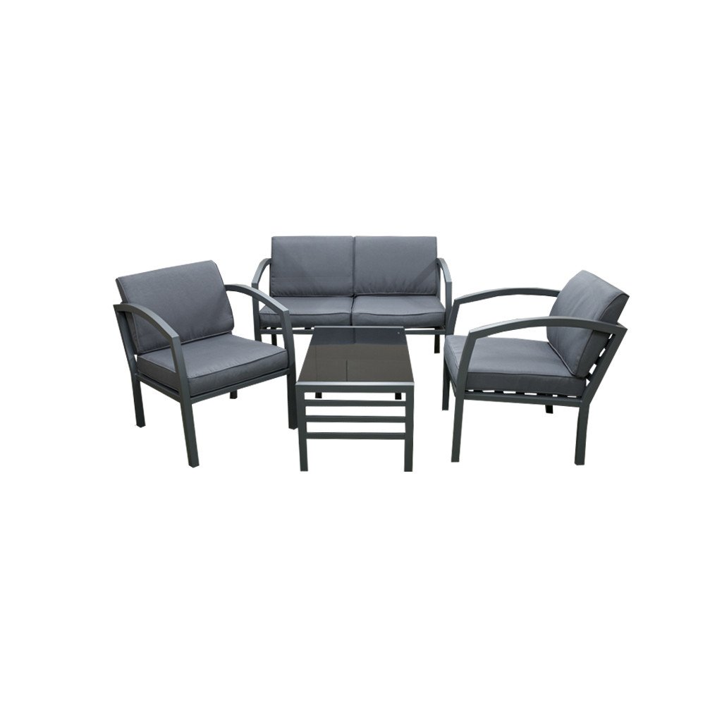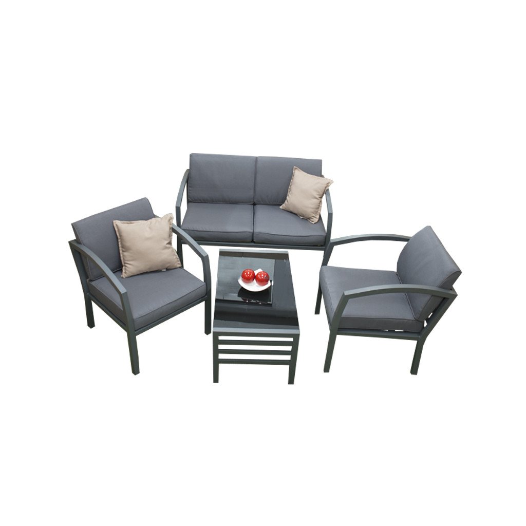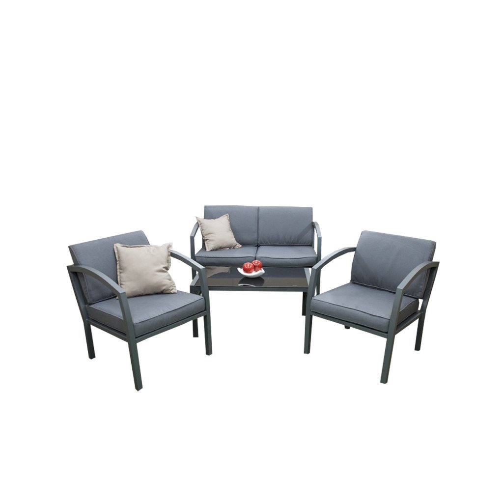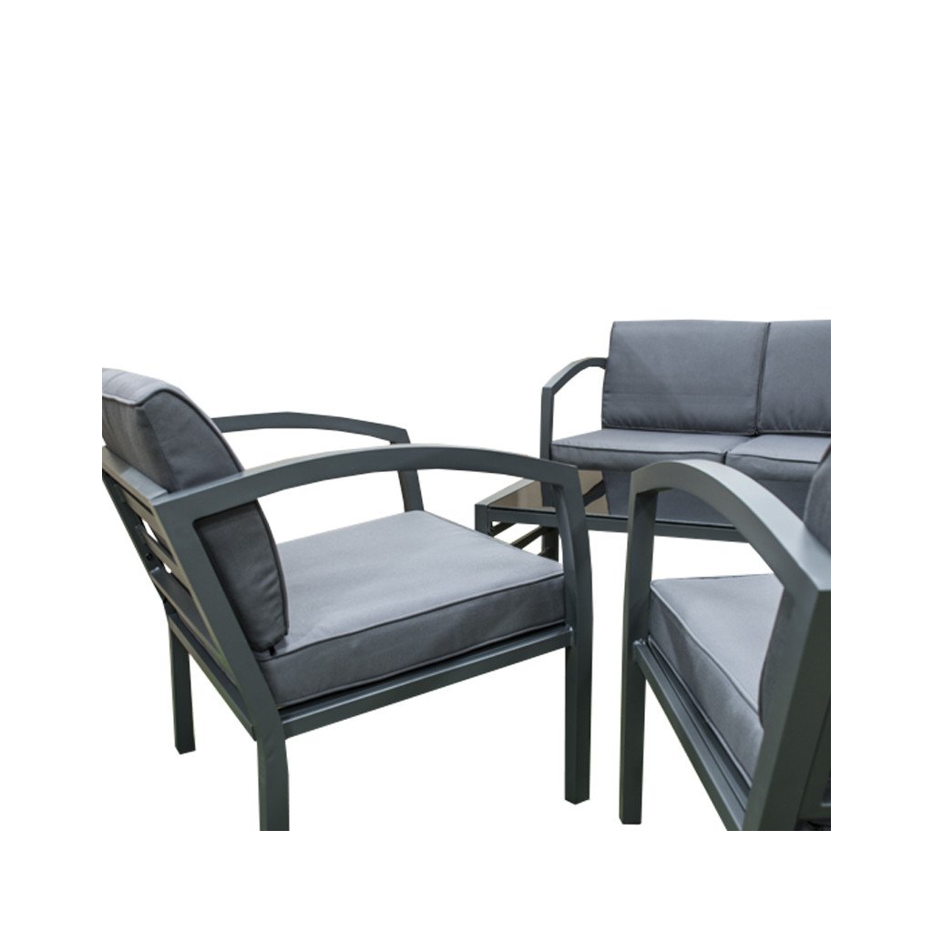 Kvalitní a stabilní hliníková konstrukce v antracitové barvě je kombinována s odolnými polyesterovými sedáky a nadýchanými opěrnými polštáři, které nabízí maximální pohodlí. Polstry jsou vybaveny zipy, což umožňuje je jednoduše vyjmout a vyprat. Set tvoří dvoumístná pohovka, dvě křesla a stolek se skleněnou deskou.