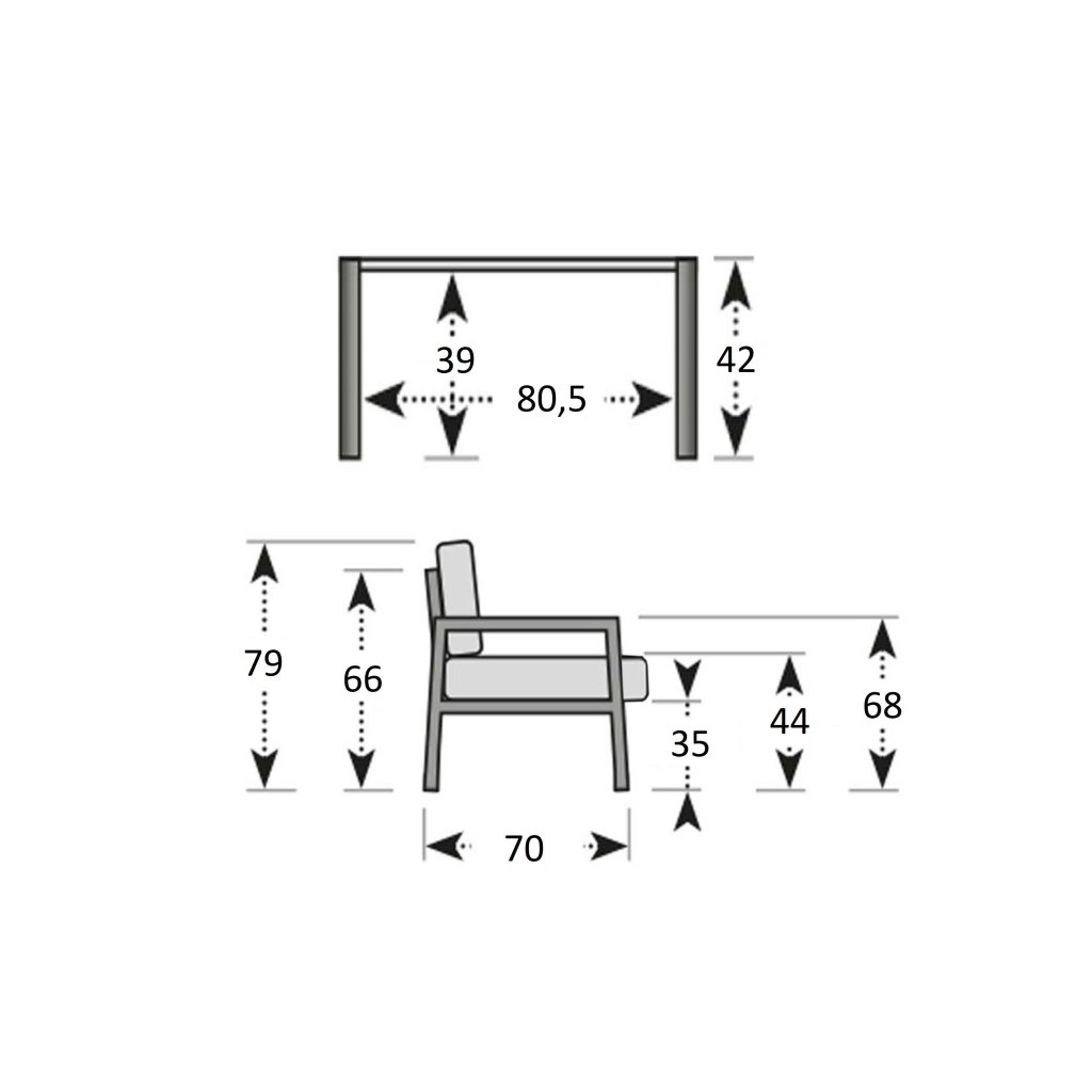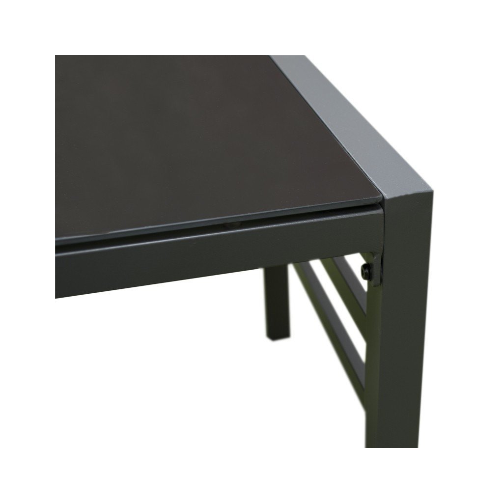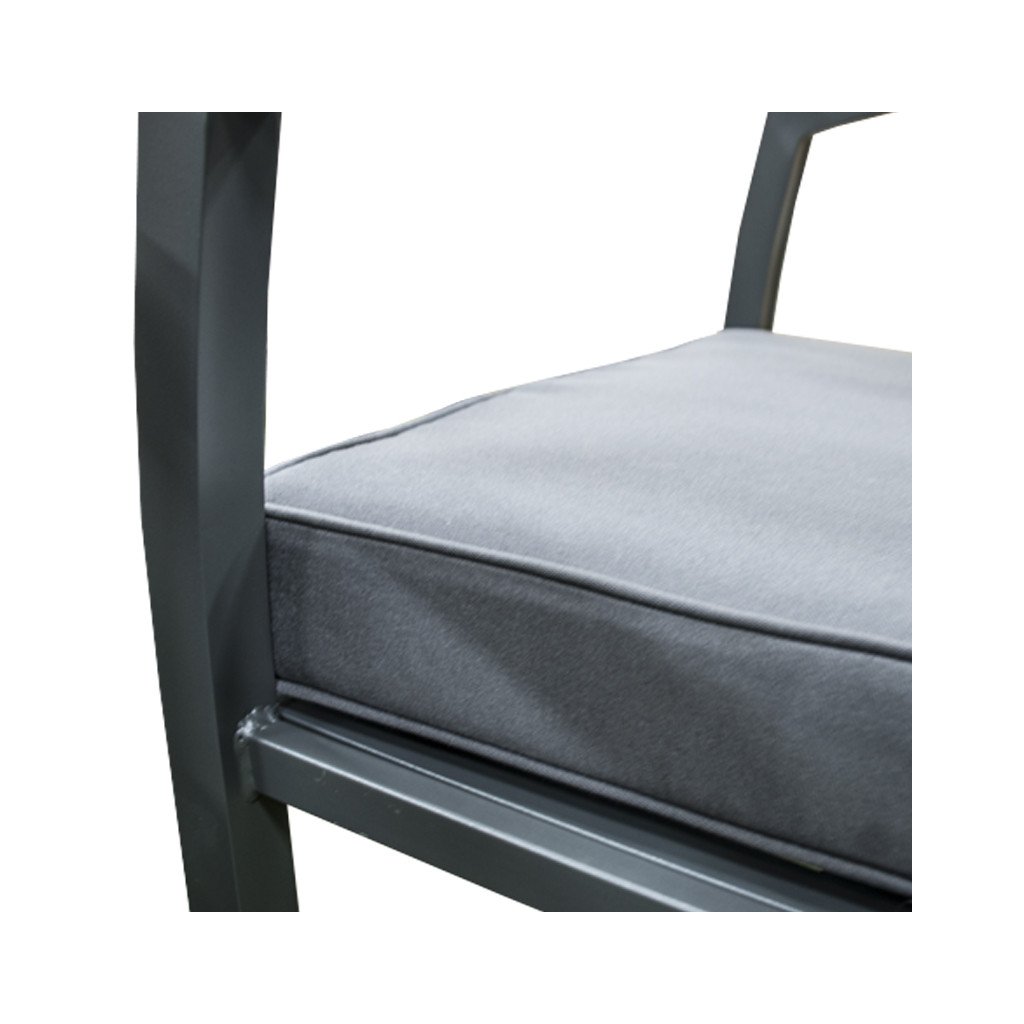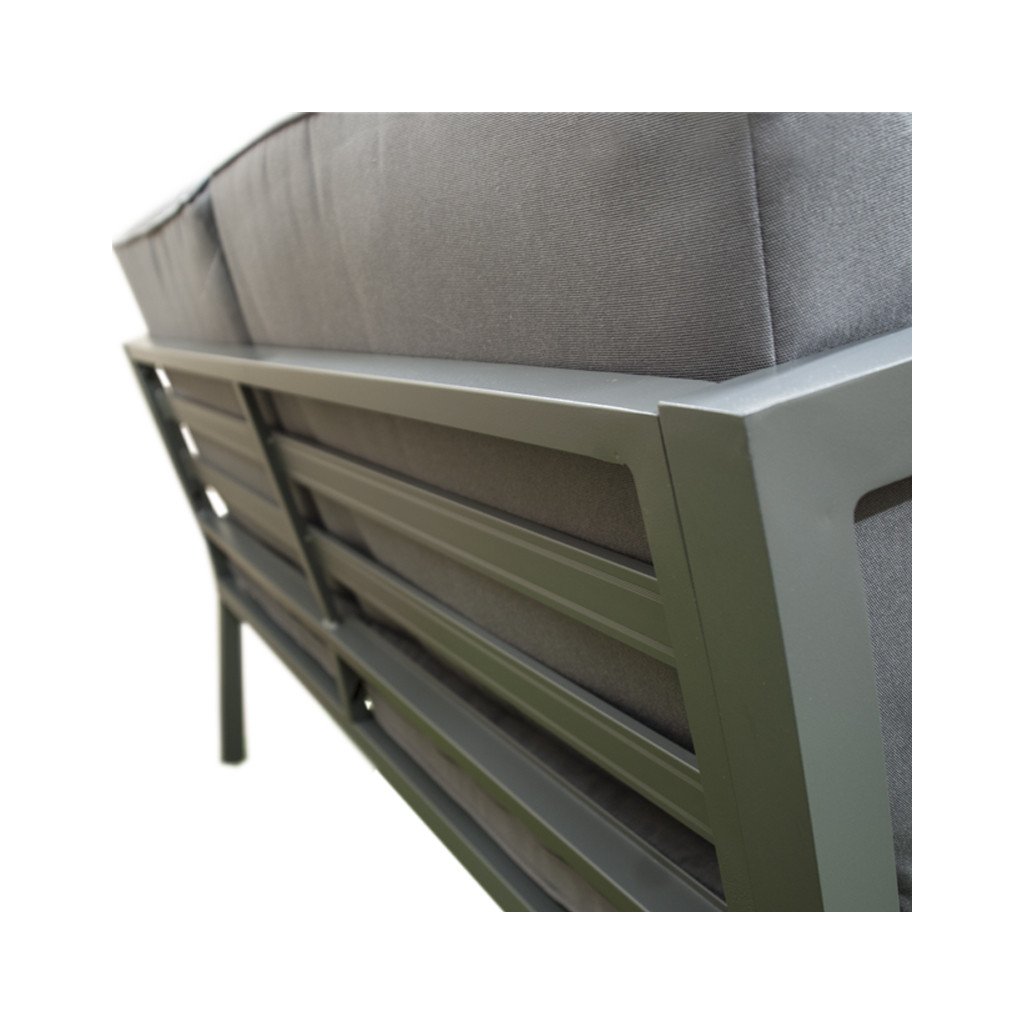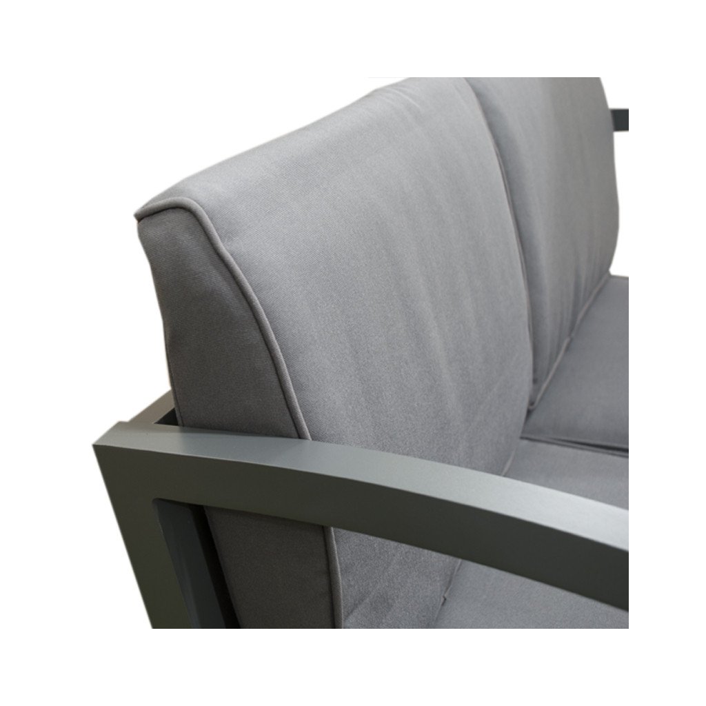 Kvalitní a stabilní hliníková konstrukce v antracitové barvě je kombinována s odolnými polyesterovými sedáky a nadýchanými opěrnými polštáři, které nabízí maximální pohodlí. Polstry jsou vybaveny zipy, což umožňuje je jednoduše vyjmout a vyprat. Set tvoří dvoumístná pohovka, dvě křesla a stolek se skleněnou deskou.