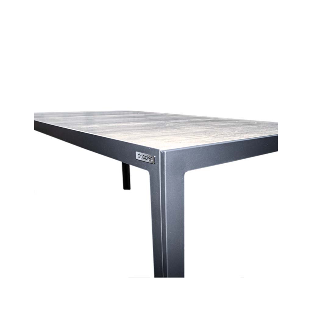 Konstrukce stolu je z hliníku, ošetřeného práškovým nástřikem v antracitové barvě, který stůl chrání proti korozi a výrazně prodlužuje jeho životnost. Velkou předností stolu je také jeho odolná keramická deska krásné žíhané šedé barvy.