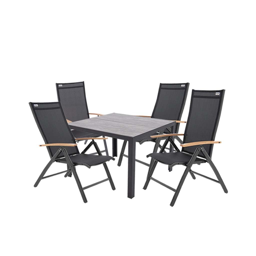 Skládá se z: 4x křeslo, 1x stůl Bergamo 90 x 90 x 74 cm