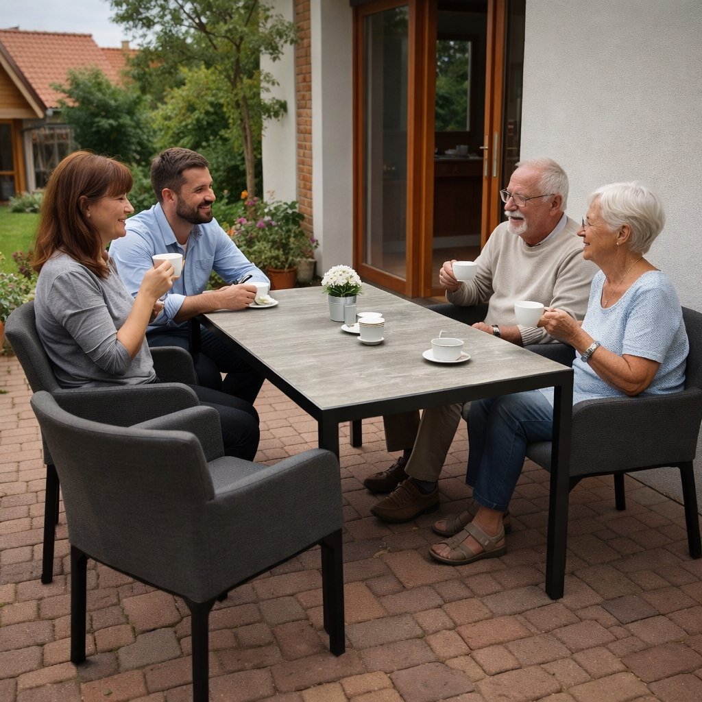 Křesla skvěle ladí se stolem BERGAMO, jenž má jedinečný vzhled díky pevné keramické desce stolu. Barva desky je v provedení žíhaná šedá. Stabilní konstrukce stolu je z odolné hliníkové slitiny s ochranným práškovým nástřikem v antracitové barvě. Stůl je odolný, s dlouhou životností.