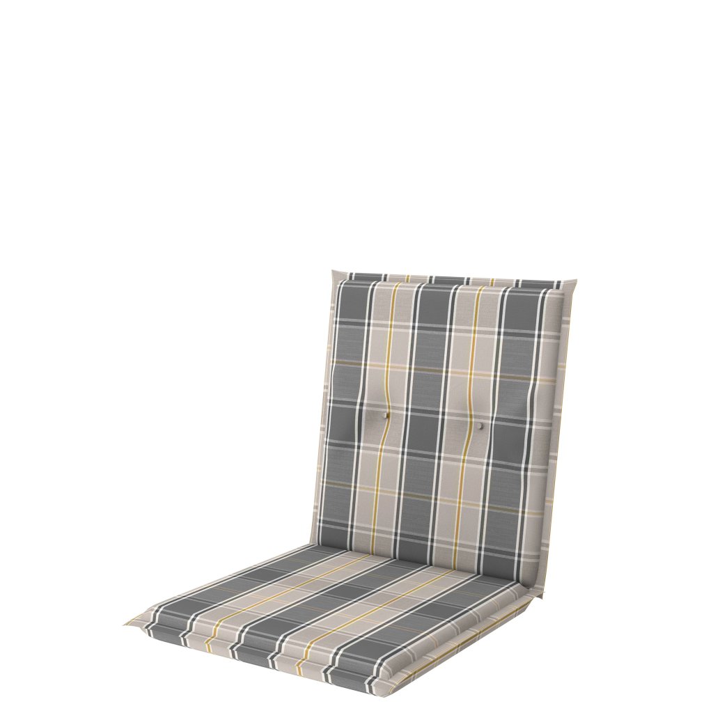 Polstr s nízkou opěrkou na zahradní nábytek řady BRILLANT v provedení s obšitým lemem, prošitý kroužkově 2x v opěradle. Uchycení je pomocí posuvné spony. Díky sponě si můžete nastavit velikost dle rozměru a druhu židle, spona je pevná a nevytahuje se. Upevnění sedáku je pomocí dvou tkaniček v ohybu polstru. Potah polstru je nesnímatelný.