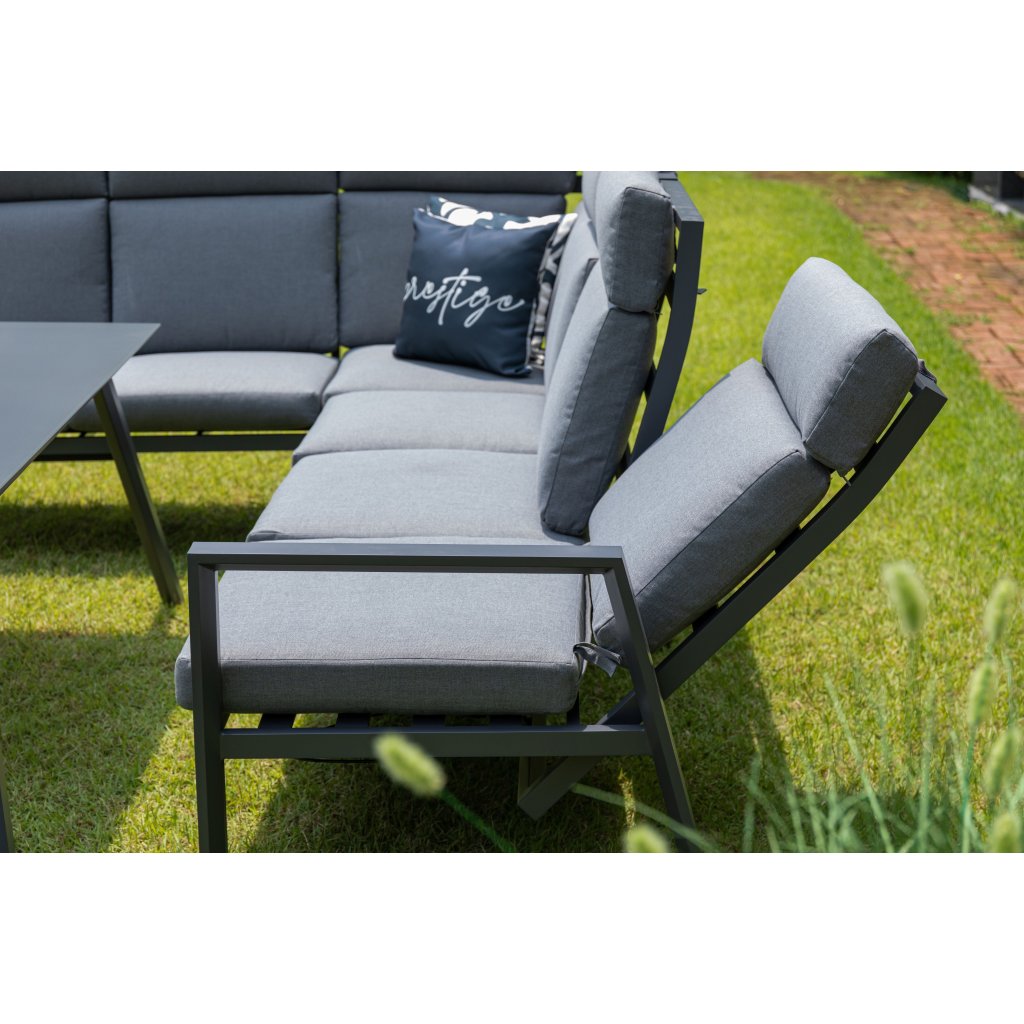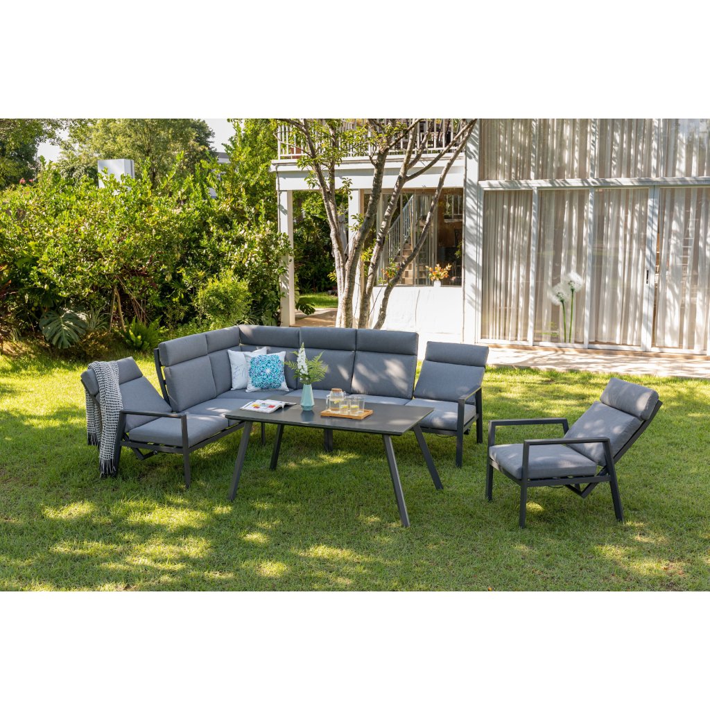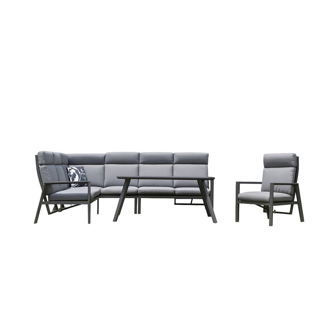 Měkké, nadýchané polstry v šedé barvě mají potahy ze 100% polyesteru, který je odolný vůči oděru, slunečnímu záření i vlhkosti. Potahy jsou snímatelné a pratelné, takže udržení sestavy v perfektním stavu je snadné.
