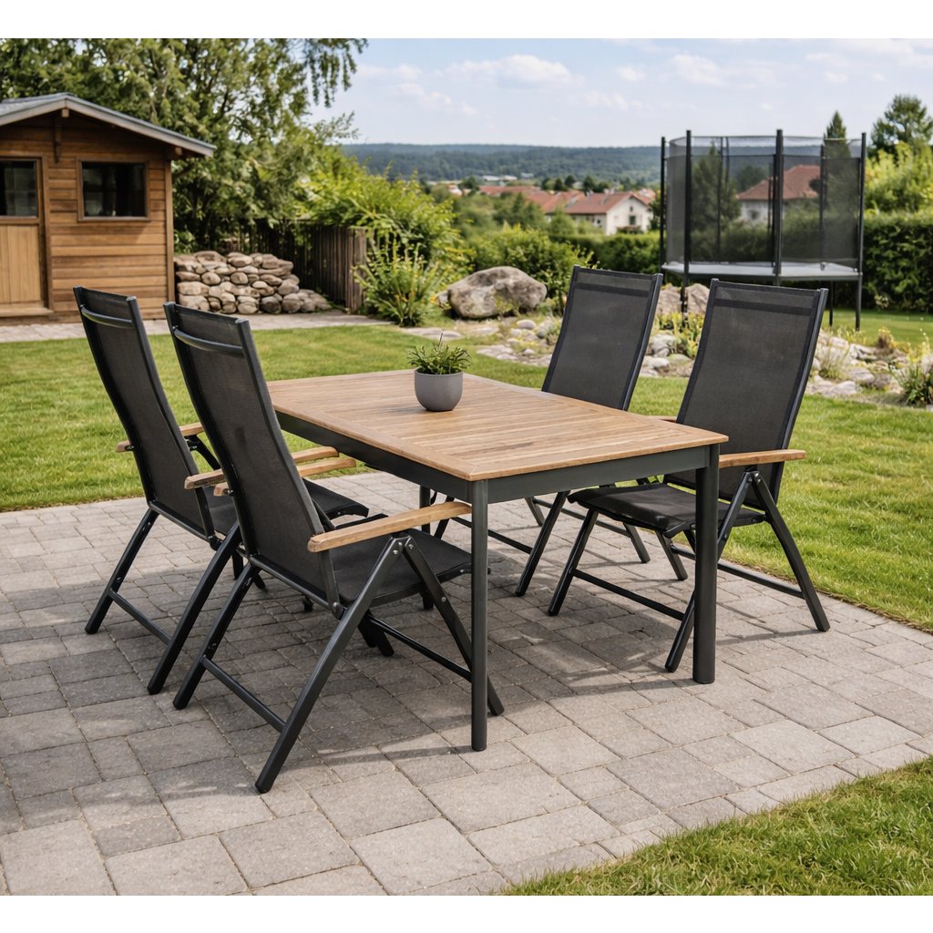 Sestava obsahuje 4 hliníková křesla s polohovatelnou opěrkou zad. Područky křesel jsou vyrobeny z teakového dřeva a zajistí Vám dokonalé pohodlí během Vašich chvilek relaxace. Díky jednoduchému designu lze křeslo snadno rozložit i složit. Během skladování Vám složená křesla zaberou minimum skladovací plochy.