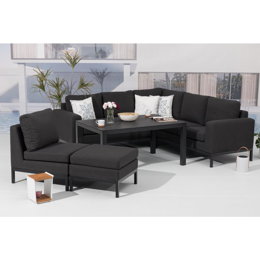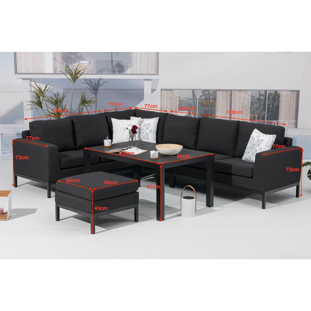 Konstrukce je vyrobena z lehkého odolného a bezúdržbového hliníku. Sestava obsahuje rohovou pohovku, rohový díl, lavici, taburet a stůl. Součástí jsou nadýchané tmavě šedé polstry, potahy jsou snímatelné (lze je prát) a jsou z vyrobené z vysoce kvalitní textilie LIKA-TEX®.