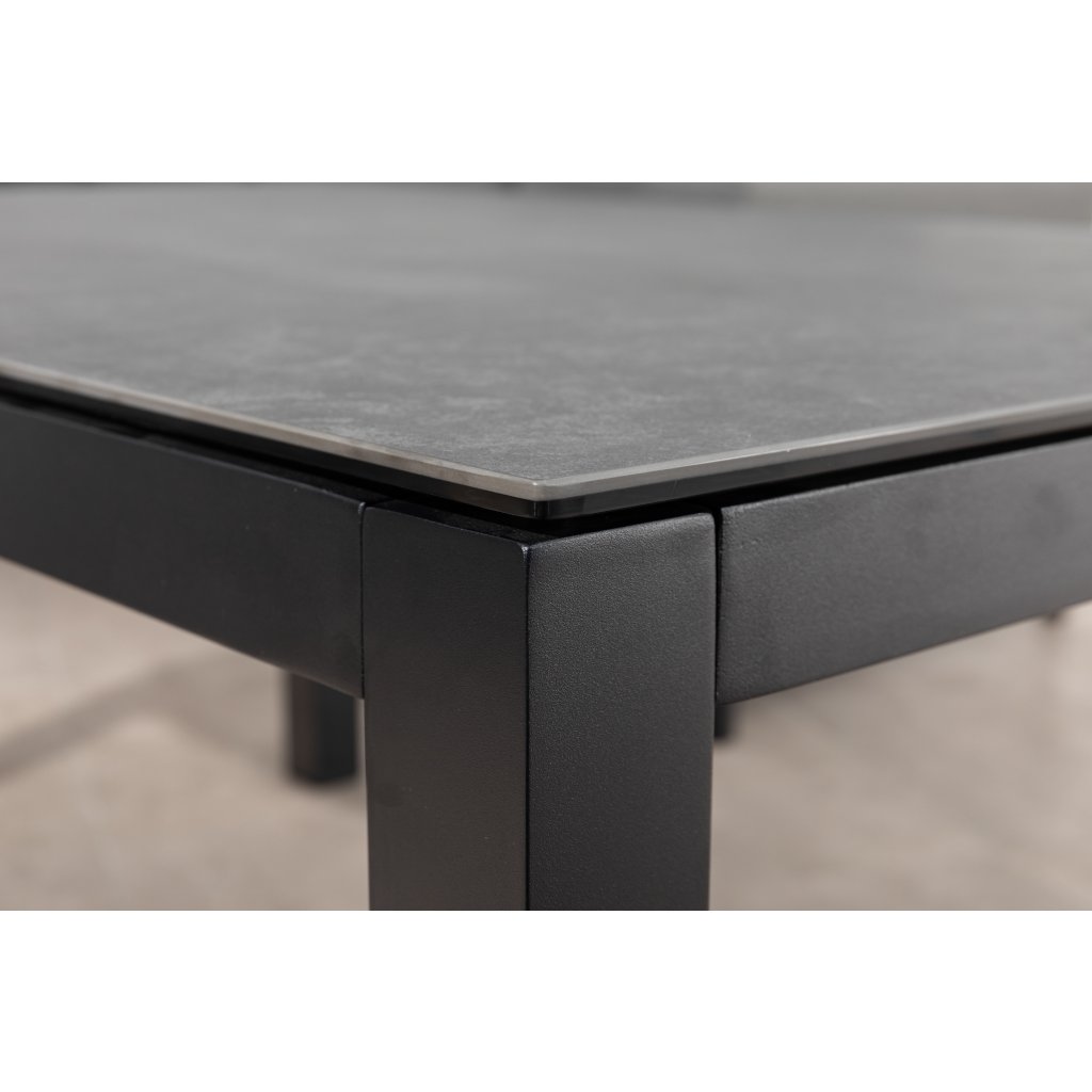 Stůl má skleněnou desku o tloušťce 5 mm, která zaujme keramickým nástřikem. Desku doplňuje odolná hliníková konstrukce zaručující dlouhou životnost.