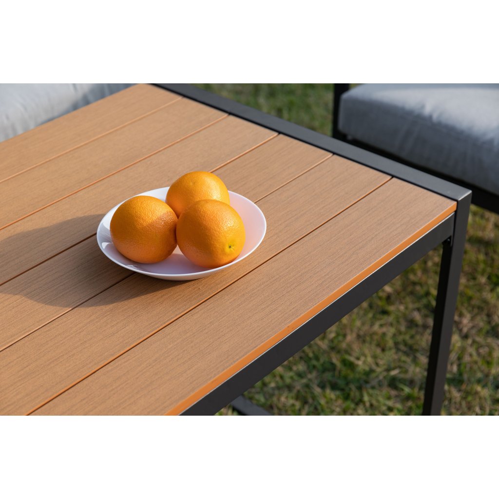 Stůl s polywoodovou deskou, navržený pro snadnou údržbu, se skvěle hodí pro rodinné obědy nebo večerní posezení s přáteli. Díky regulačním kolečkům na pohovkách, křeslech i stole se přizpůsobíte každému terénu a zajistíte si dokonalou stabilitu.