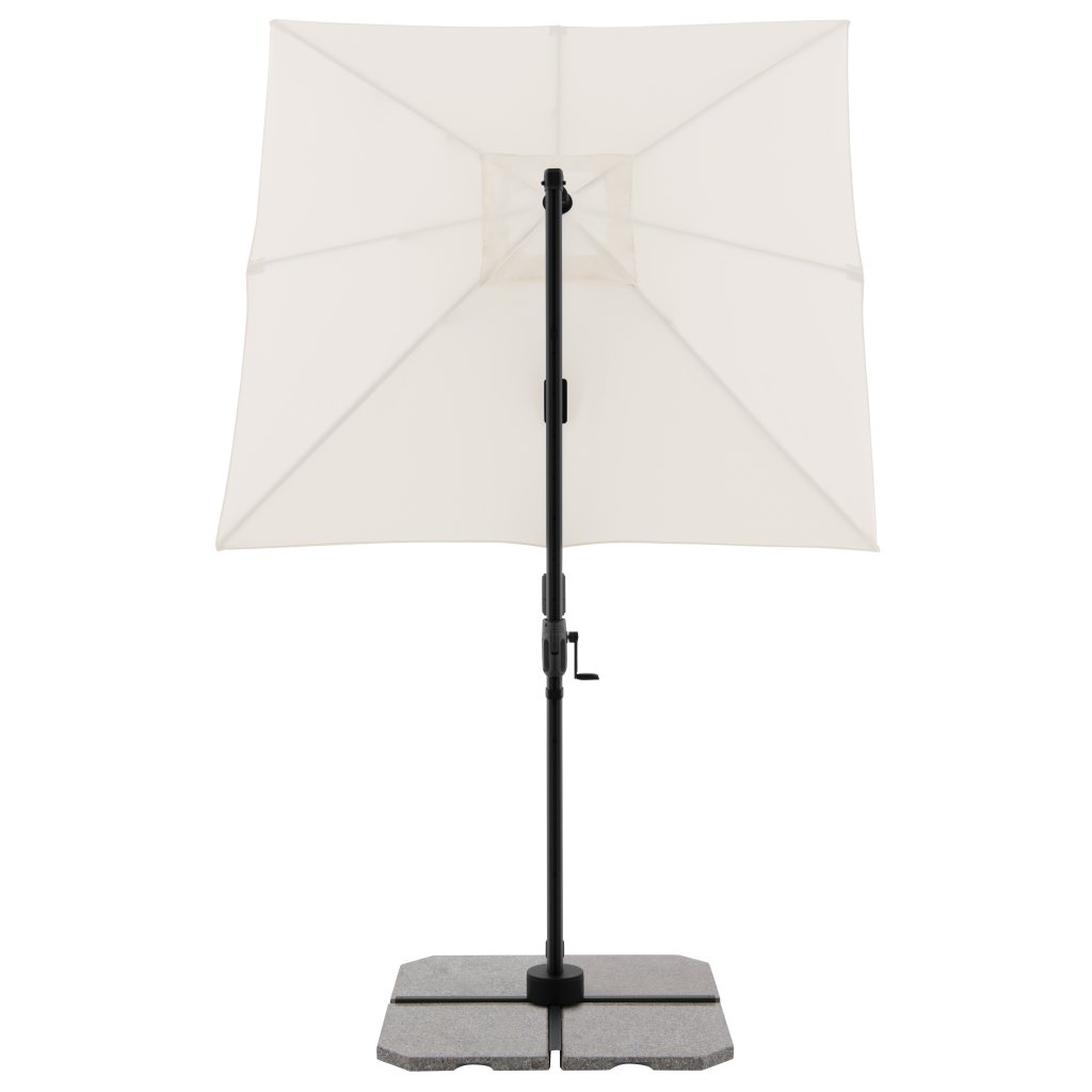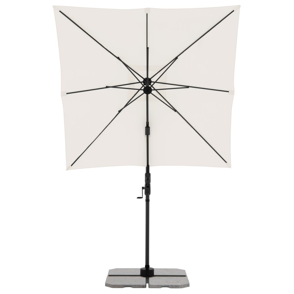Slunečník má stabilní hliníkovou konstrukci, je vybaven klikovým mechanismem a je snadno ovladatelný. Potah slunečníku je vyroben z polyesterové tkaniny, je vodoodpudivý a má dobrou UV ochranu SPF 50+. Slunečník je otočný o 360 °, je možné ho naklápět v sedmi pozicích a axiálně natáčet na obě strany.