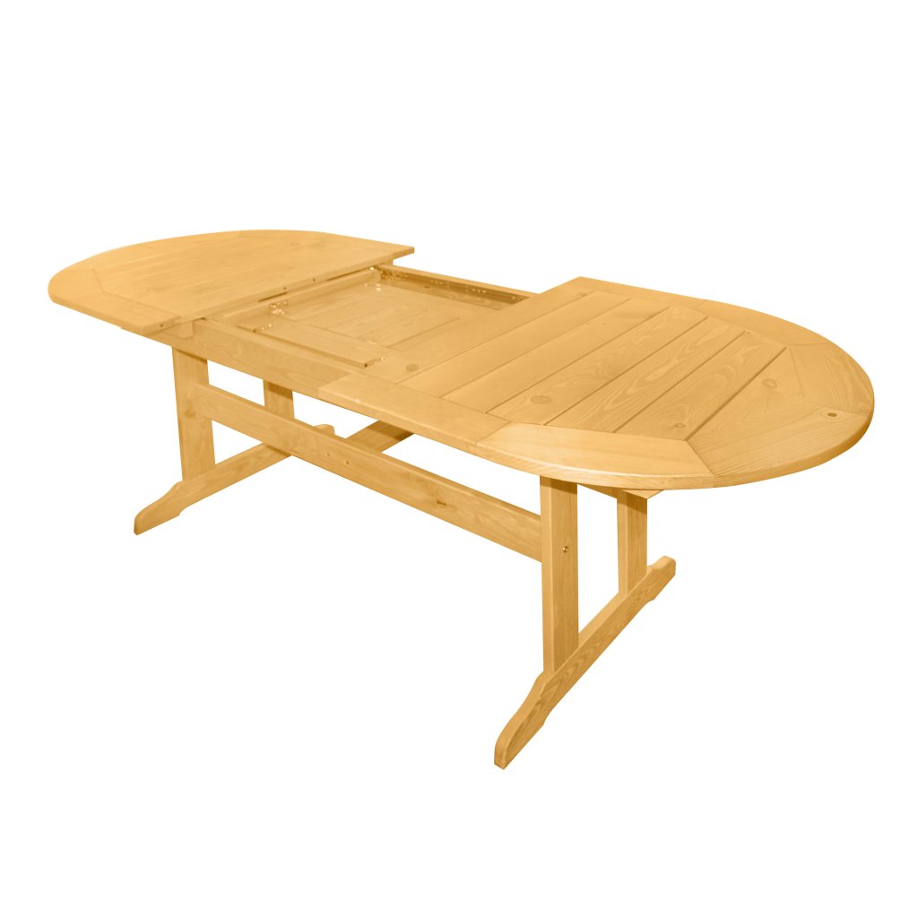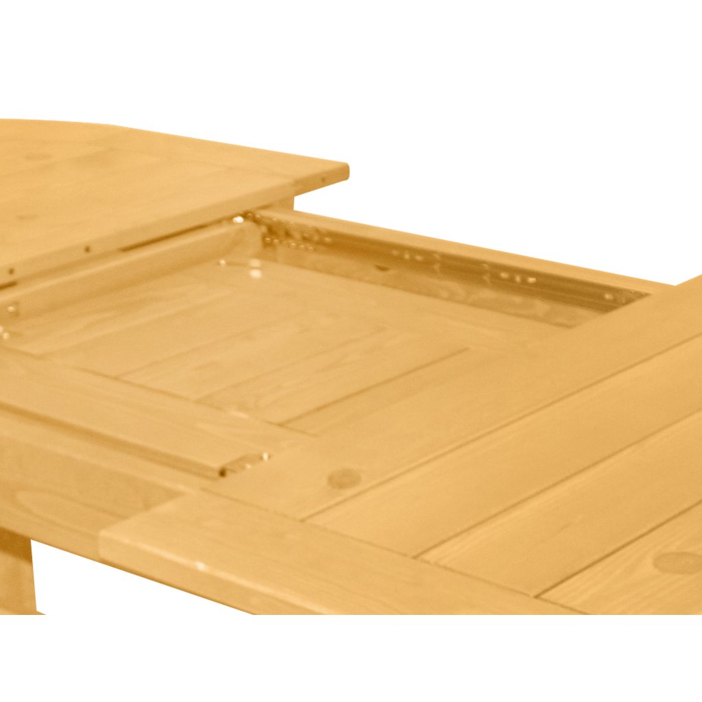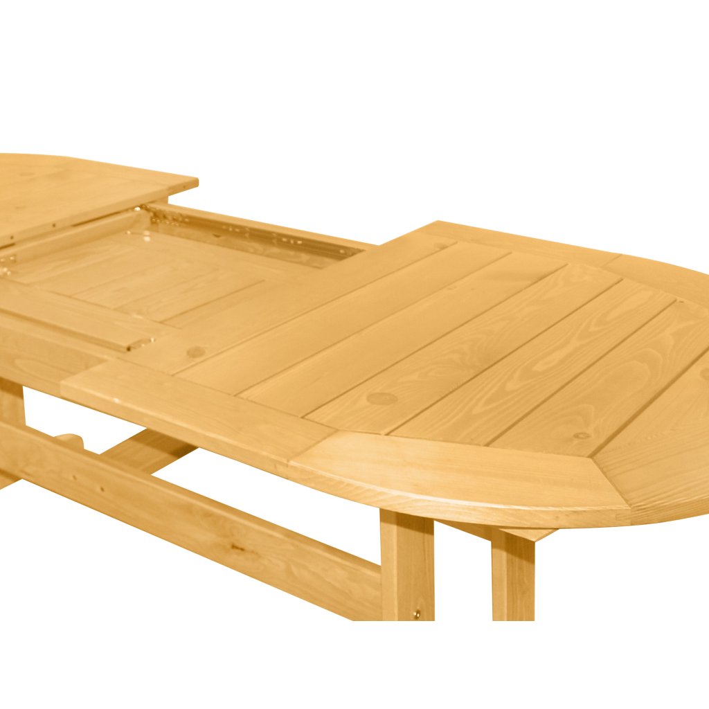 Dále souprava obsahuje rozkládací stůl s pevnou dřevěnou konstrukcí včetně masivní desky z přírodního, kvalitního dřeva ze severské borovice. Zakulacené hrany masivní desky stolu, stabilní mohutná konstrukce nohou stolu, to vše přidává rozkládacímu stolu DOVER výborný retro vzhled. Díky jedinečnému, jednoduchému systému zvládne rozložení stolu jeden člověk. Sklopná konstrukce s rychlouzamykatelným zámkem zajišťuje rychlé a pevné skládání a rozkládání stolu bez omezení jeho stability. Zahradní masivní stůl DOVER je všestranný, stylový kus nábytku, který se hodí jak do moderně řešených zahrad, tak na klasické přírodní zahrady a terasy.
