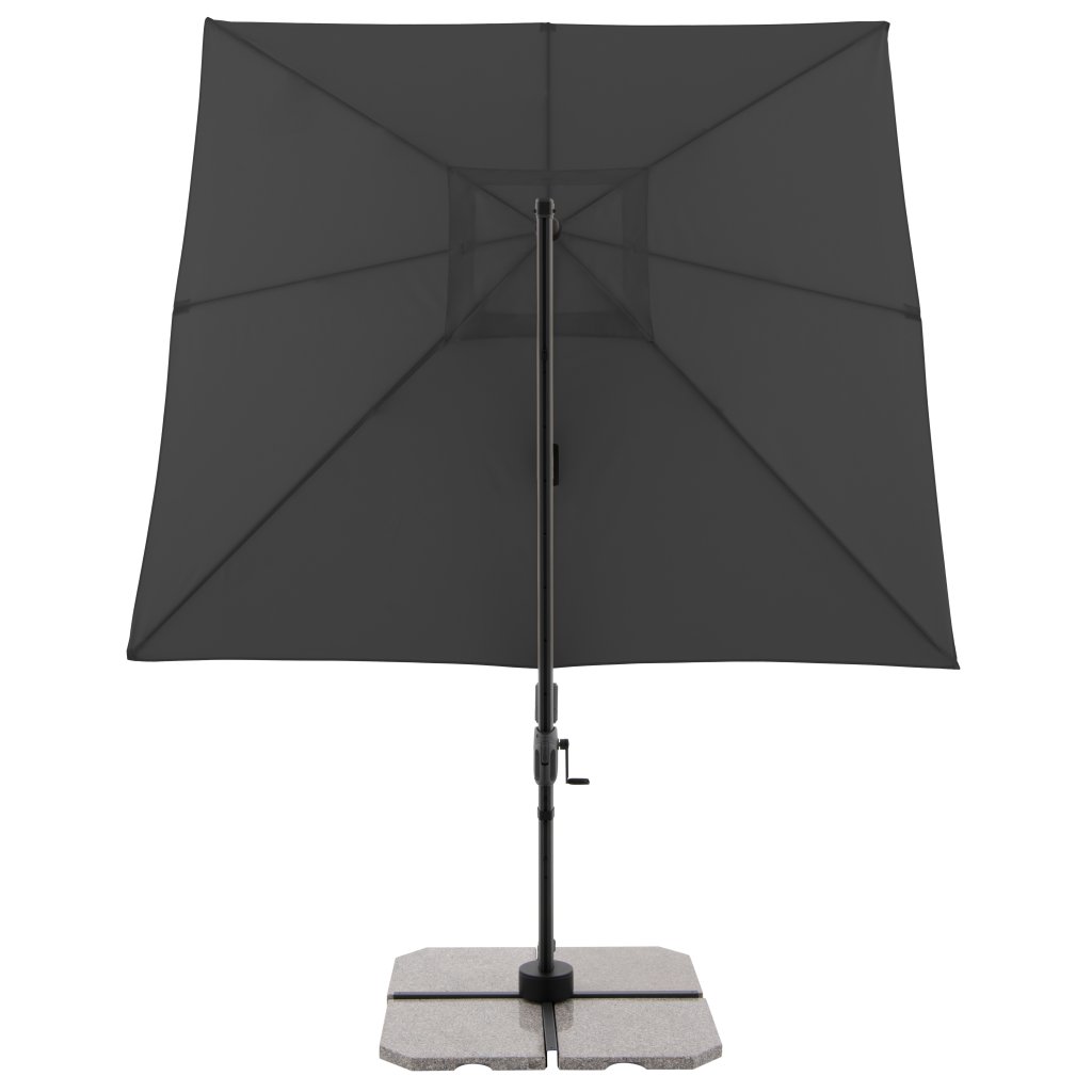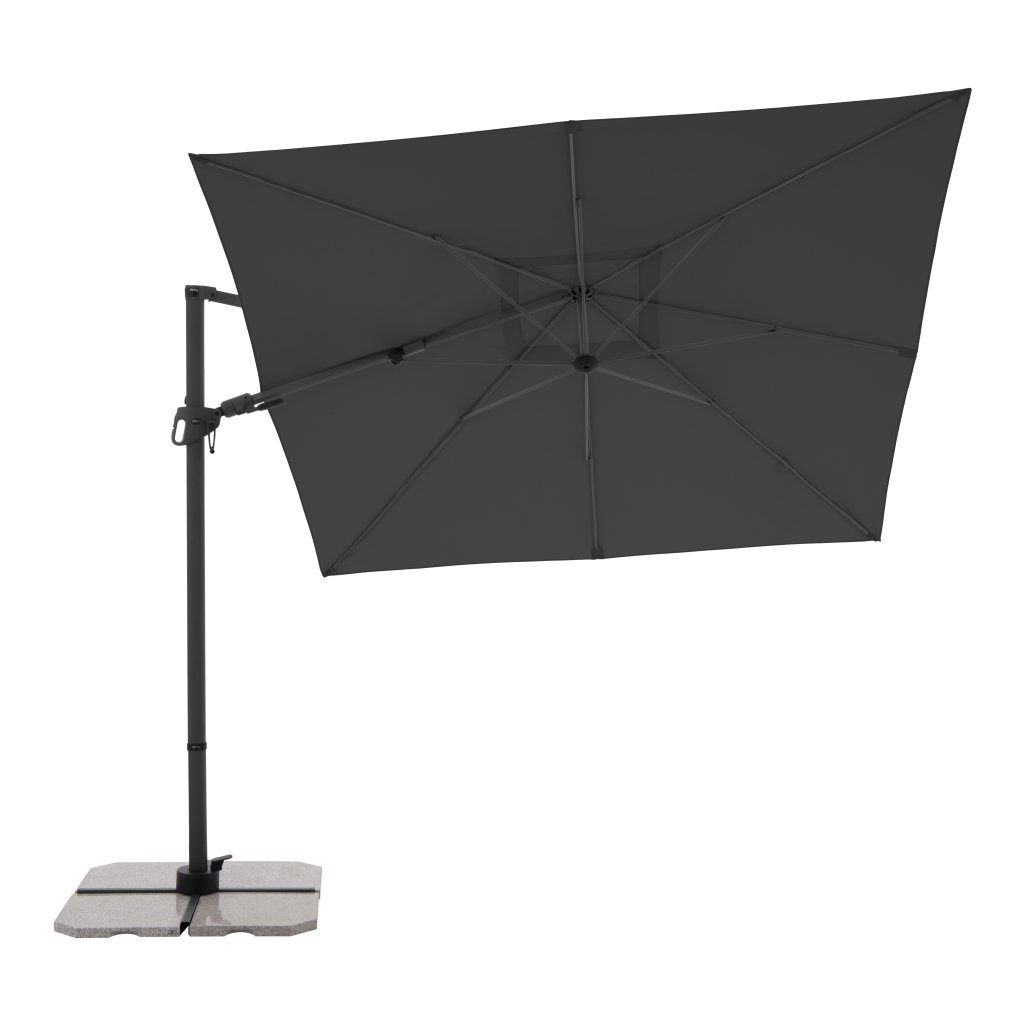 Slunečník má stabilní hliníkovou konstrukci, je vybaven klikovým mechanismem a je snadno ovladatelný. Potah slunečníku je vyroben z polyesterové tkaniny, je vodoodpudivý a má dobrou UV ochranu SPF 50+. Slunečník je otočný o 360°, je možné ho naklápět v sedmi pozicích a axiálně natáčet na obě strany.