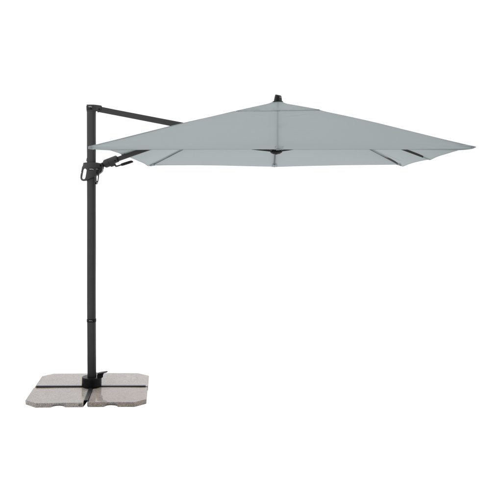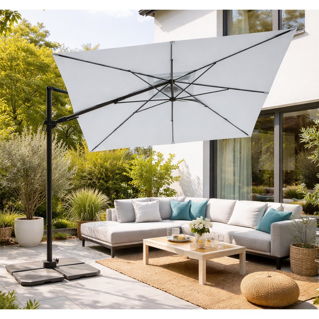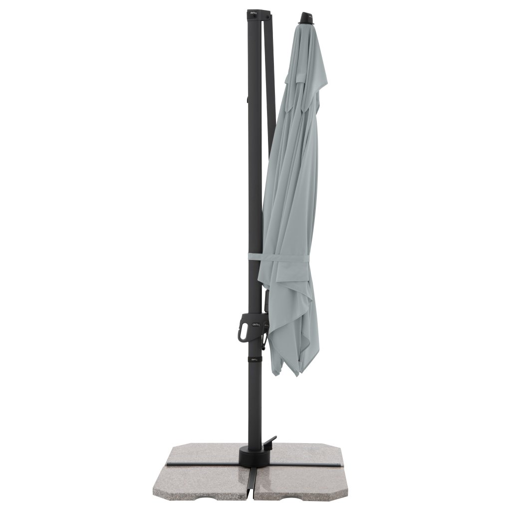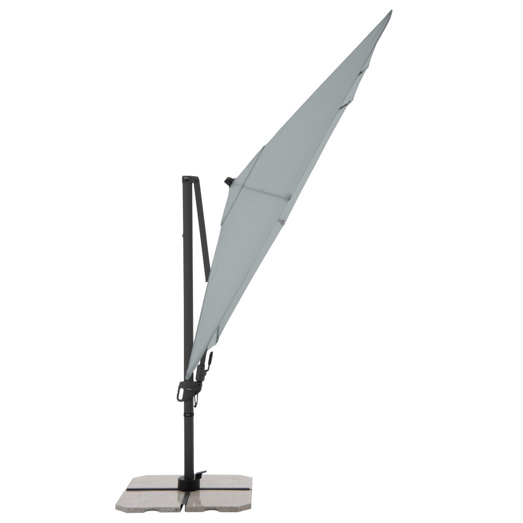 Slunečník má stabilní hliníkovou konstrukci, je vybaven klikovým mechanismem a je snadno ovladatelný. Potah slunečníku je vyroben z polyesterové tkaniny, je vodoodpudivý a má dobrou UV ochranu SPF 50+. Slunečník je otočný o 360°, je možné ho naklápět v sedmi pozicích a axiálně natáčet na obě strany.