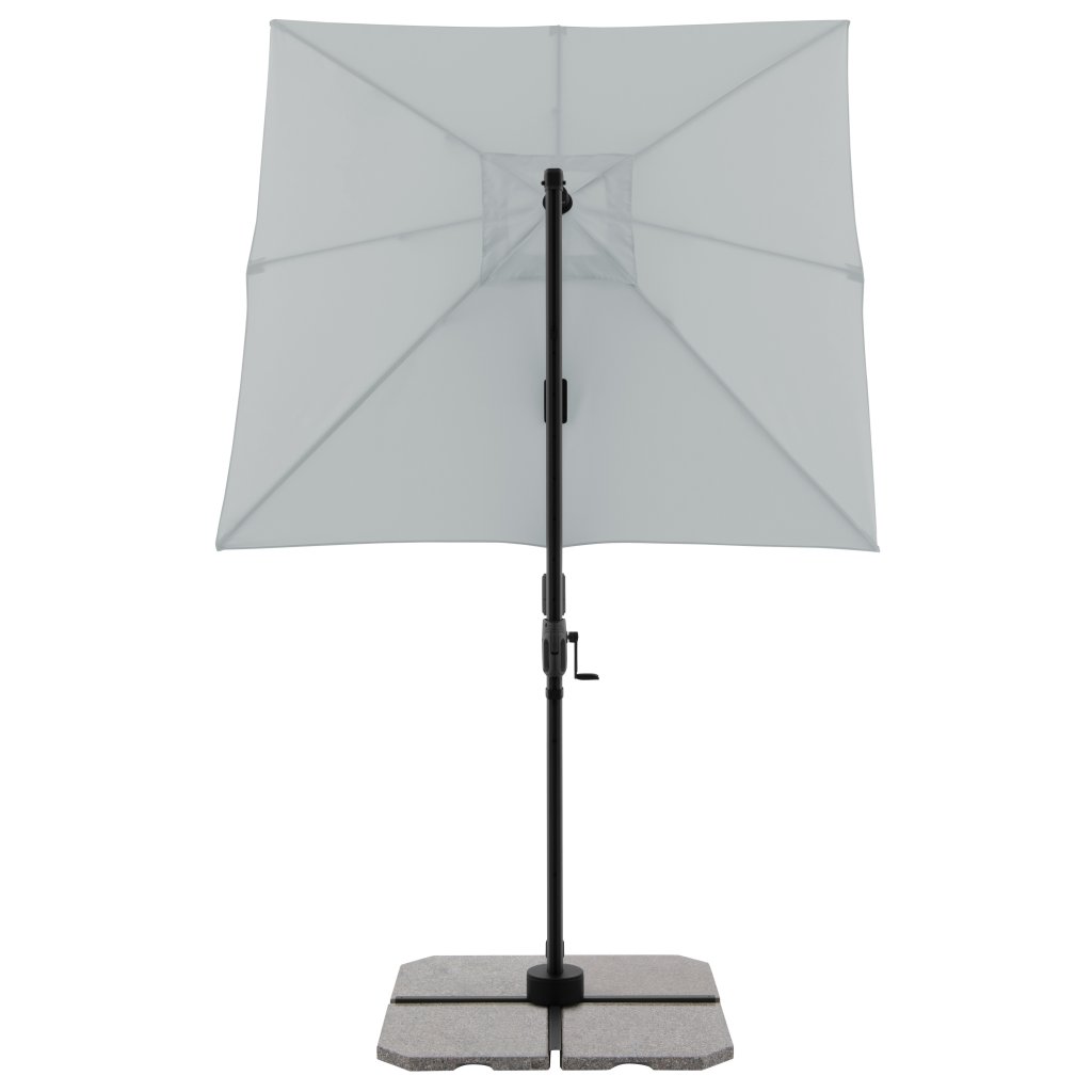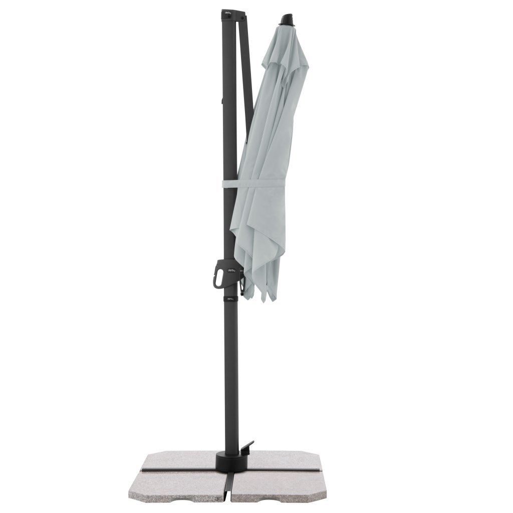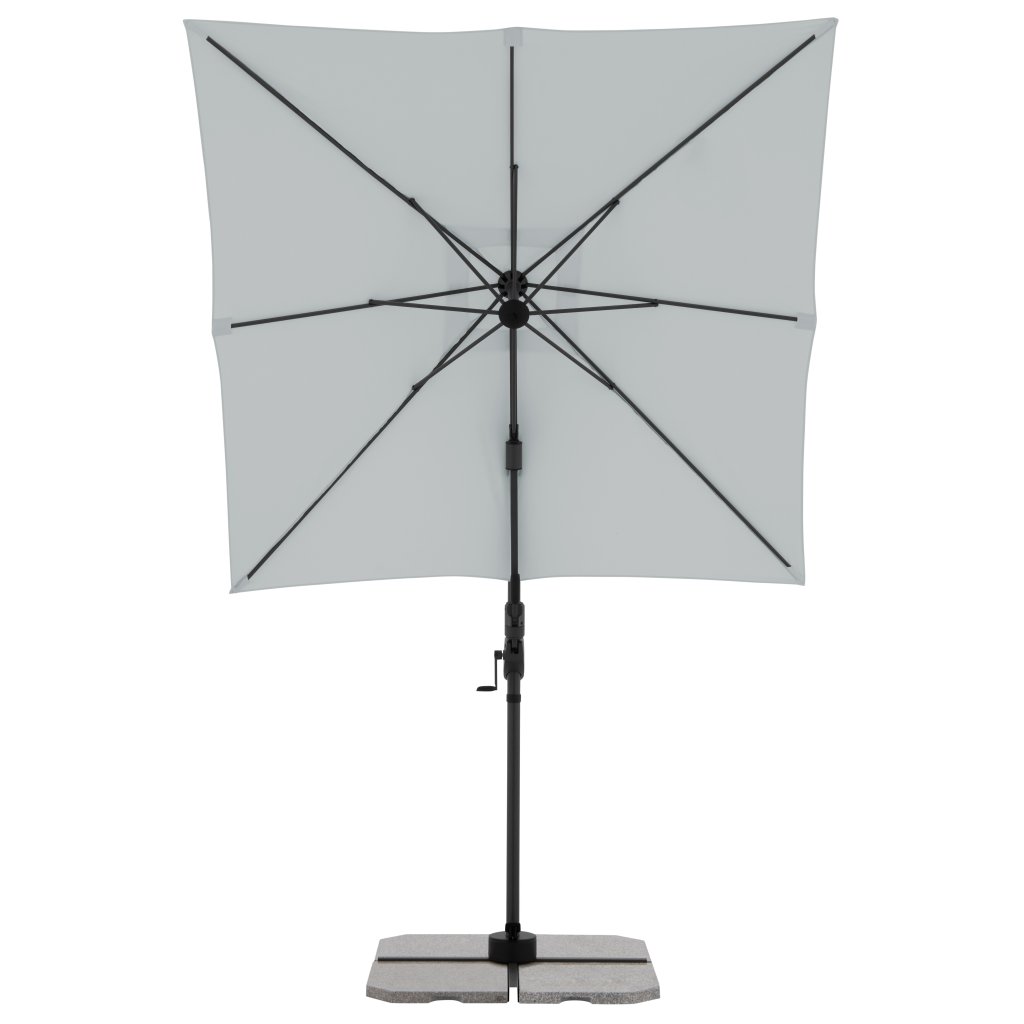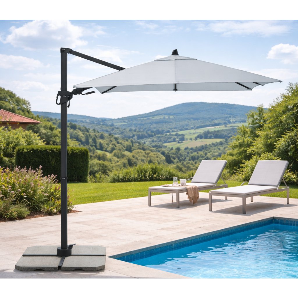 Slunečník má stabilní hliníkovou konstrukci, je vybaven klikovým mechanismem a je snadno ovladatelný. Potah slunečníku je vyroben z polyesterové tkaniny, je vodoodpudivý a má dobrou UV ochranu SPF 50+. Slunečník je otočný o 360 °, je možné ho naklápět v sedmi pozicích a axiálně natáčet na obě strany.