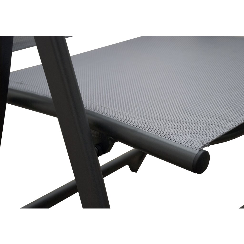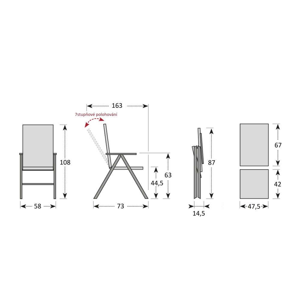 - 4× polohovací křeslo: hliníkový rám, výplet z šedé textilie, 7 poloh, snadné skládání, rozměry: 58 × 73 × 108 cm (sedák 47,5 × 42 cm), max. nosnost cca 100 kg.