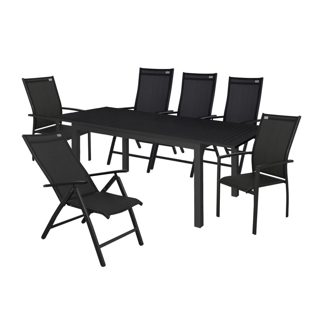 Skládá se z: 4x polohovací křeslo, 2x stohovací židle, 1x stůl 150/210 x 90 cm