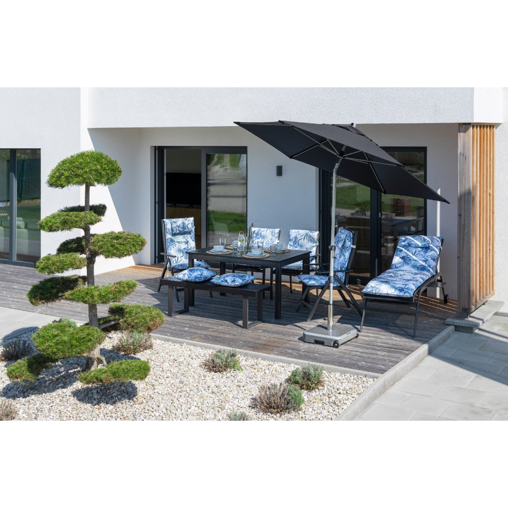 | Vlastnosti a funkce: | Odolný povětrnostním vlivům, Výškově nastavitelný, Otočný kolem osy, Naklápěcí, Snímatelný/ručně pratelný potah slunečníku, Automatické otevírání klikou |