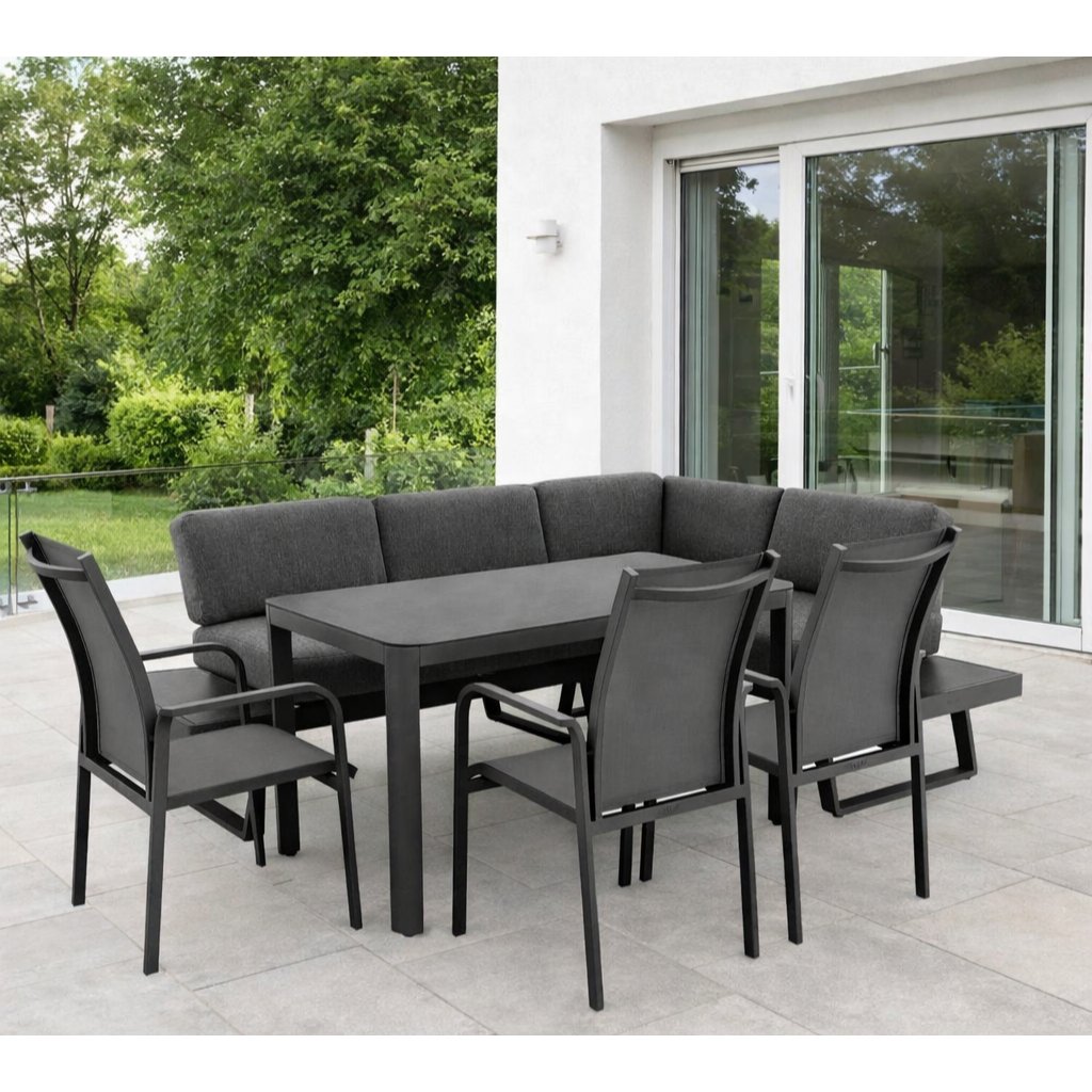 Naše šestidílná jídelní souprava Expert Plus Aversa Keramik se pyšní hliníkovou konstrukcí, která je odolná a lehká, což ji činí ideální pro venkovní použití. Sestava obsahuje rohovou pohovku, skládající se ze dvou 2-místných pohovek, stůl a tři židle. Elegantní odkládací plochy, vyrobené ze sklokeramiky, dodávají soupravě šarm a praktickou funkčnost.