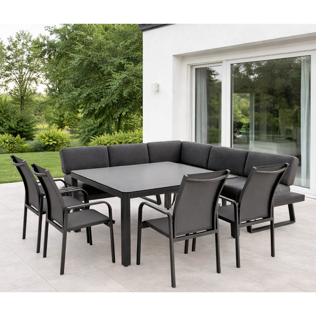 Naše sedmidílná jídelní souprava Expert Plus Aversa Keramik se pyšní hliníkovou konstrukcí, která je odolná a lehká, což ji činí ideální pro venkovní použití. Sestava obsahuje rohovou pohovku, skládající se z 2-místné a 3-místné části, přičemž 3-místná pohovka nabízí možnost polohování v 5 různých pozicích, což ji promění na pohodlné lehátko. Elegantní odkládací plochy, vyrobené ze sklokeramiky, dodávají soupravě šarm a praktickou funkčnost.
