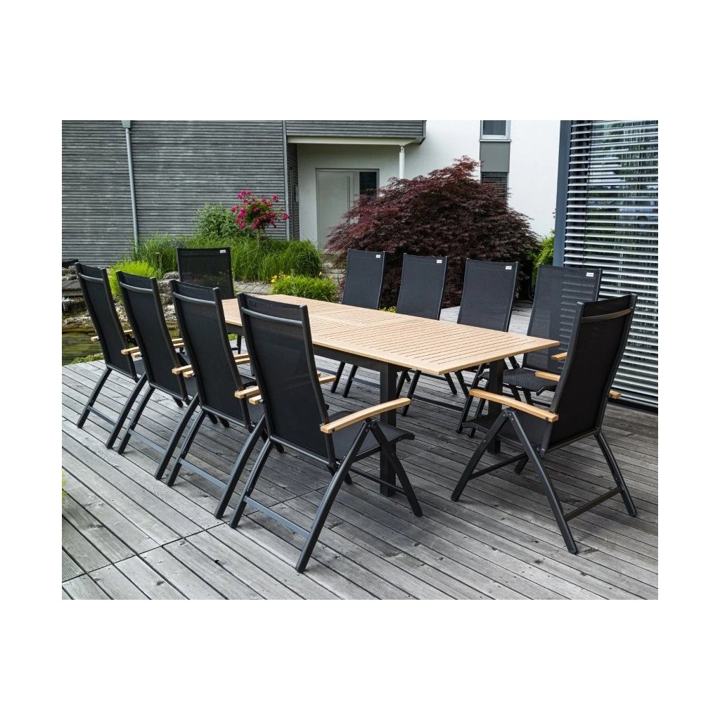 Skládá se z: 6x polohovací křeslo , 2x stohovací židle, 1x stůl 220/280 x 100 cm