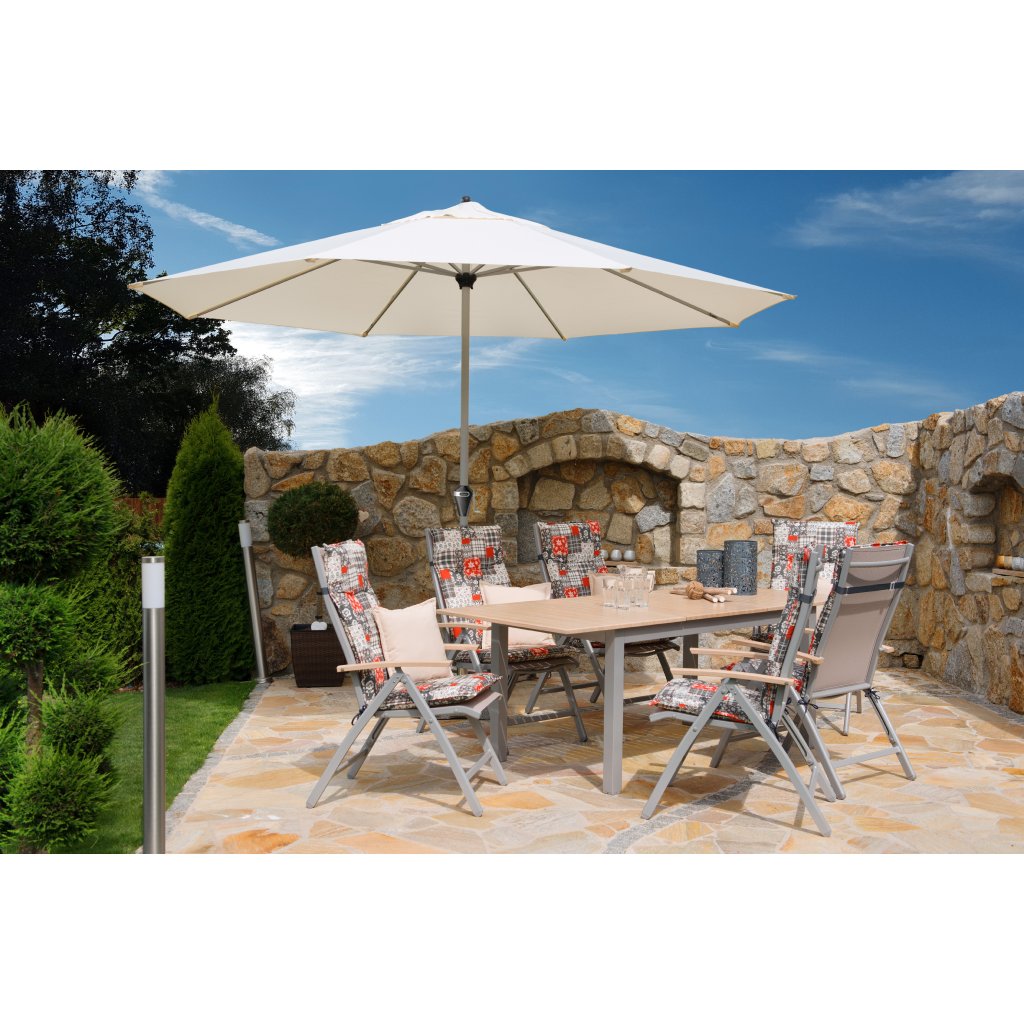 Součástí soupravy je rozkládací stůl o rozměrech 150/210 × 90 cm, který jednoduše přizpůsobíte počtu hostů. Hliníková konstrukce v šedé barvě je stabilní, odolná a bezúdržbová, stejně jako žebrovaná deska stolu s imitací dřeva. Díky regulačním kolečkům snadno vyrovnáte stůl i na nerovném povrchu.