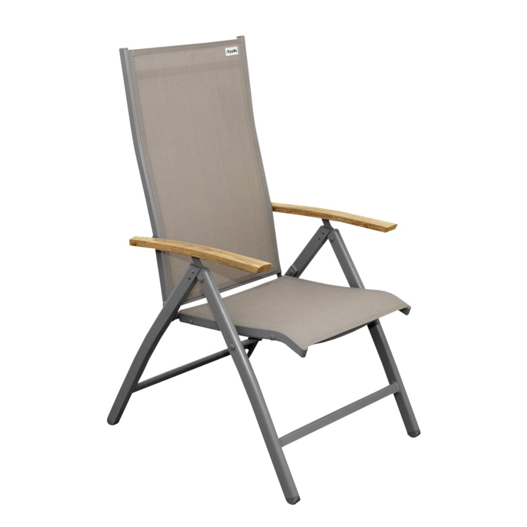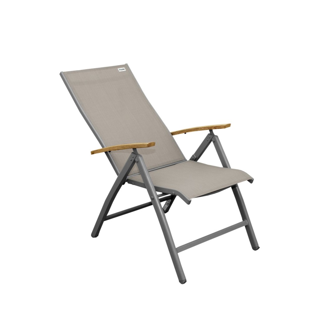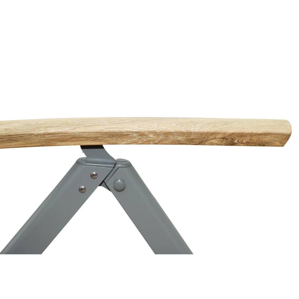 - 6× polohovací křeslo: pevná hliníková konstrukce, výplet greige, područky v dekoru dřeva, 7 poloh, rozměry: 60 × 76 × 111 cm (sedák: 47 × 49 cm), max. nosnost cca 120 kg.