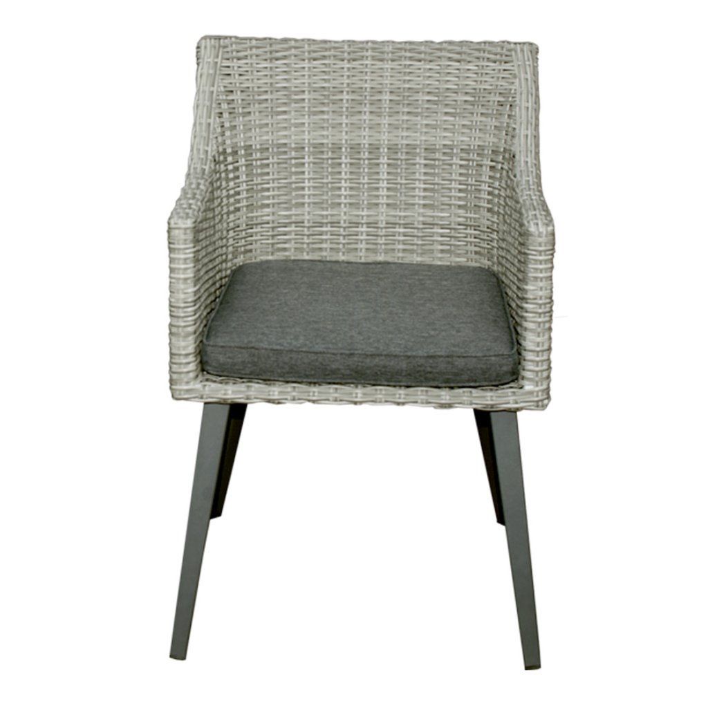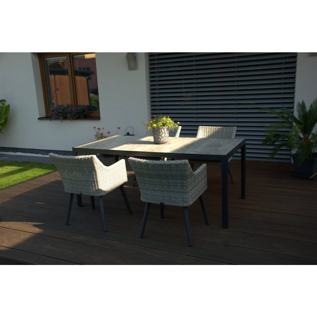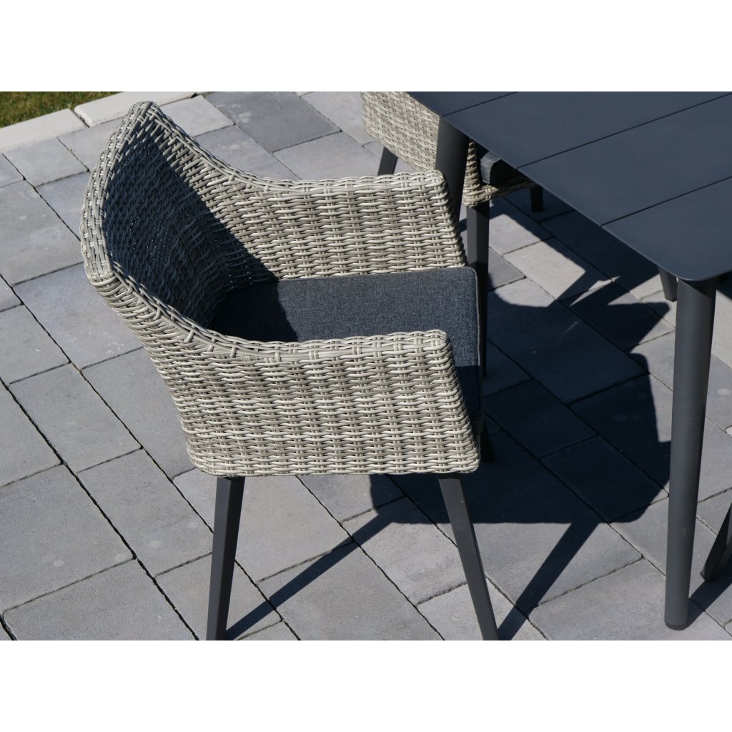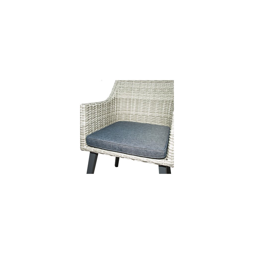 Stabilní hranatá hliníková konstrukce v antracitové barvě opletena kvalitním umělým ratanem v barvě šedý melír Vám zaručí bezúdržbové užívání zahradního sezení. Pohodlí křesla je zajištěno sedákem o síle 5 cm z polyesterové tkaniny, která je odolná vůči oděru a stálobarevná. Potah sedáku je se zipem, lze ho sejmout a vyprat.