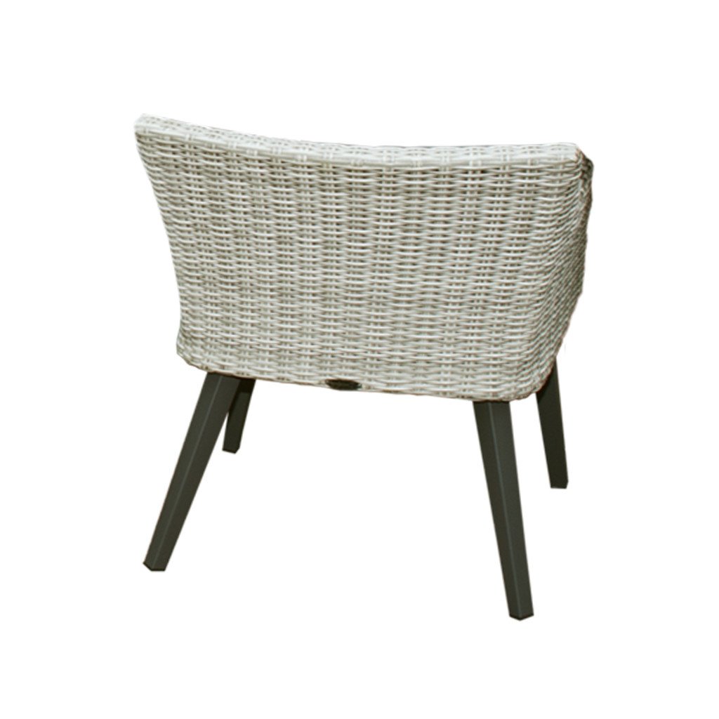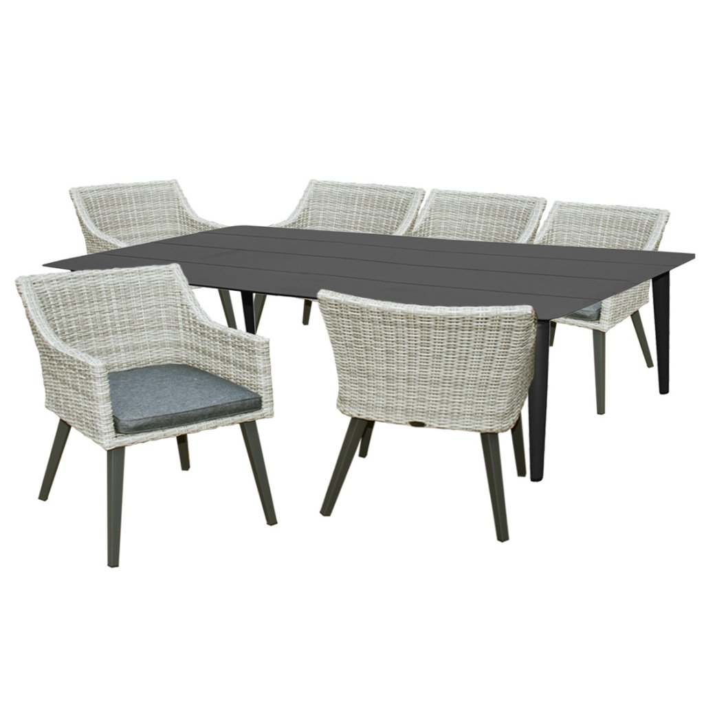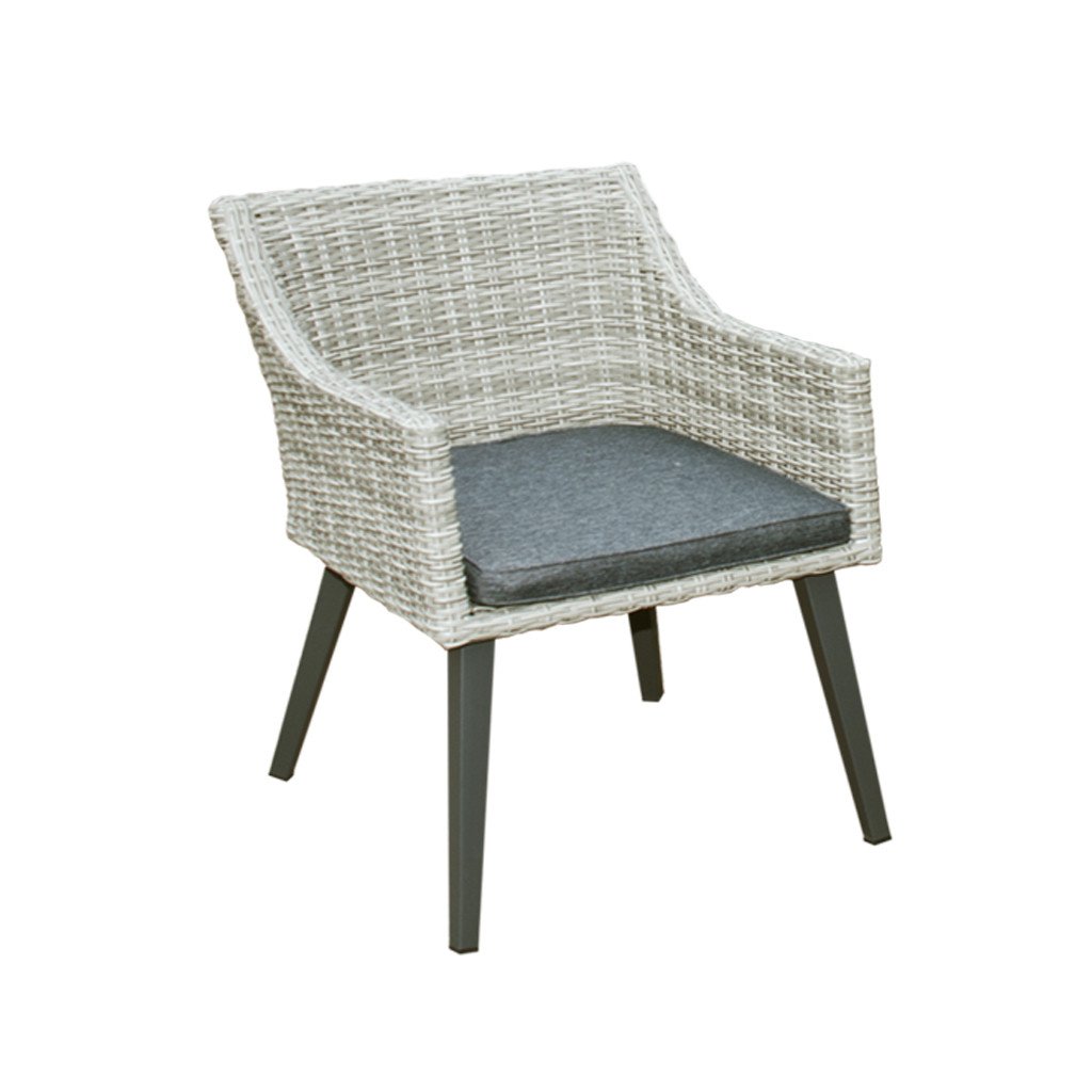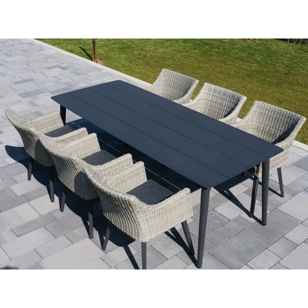 Stabilní hranatá hliníková konstrukce v antracitové barvě opletena kvalitním umělým ratanem v barvě šedý melír Vám zaručí bezúdržbové užívání zahradního sezení. Pohodlí křesla je zajištěno sedákem o síle 5 cm z polyesterové tkaniny, která je odolná vůči oděru a stálobarevná. Potah sedáku je se zipem, lze ho sejmout a vyprat.