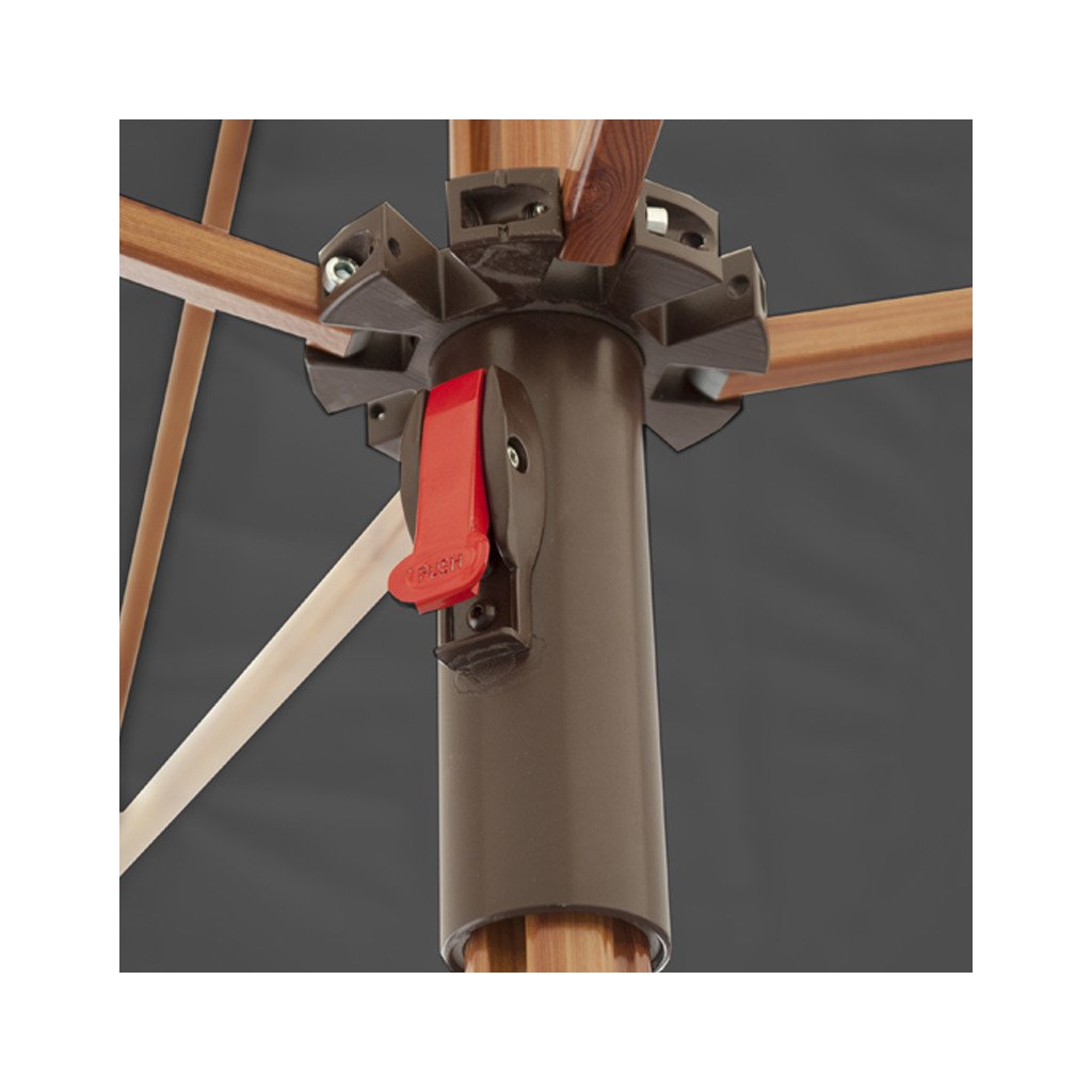 Čtvercový slunečník, který je ideální i na menší terasy. Celý rám je vyroben z robustního hliníku v imitaci dřeva. Díky doppler mechanismu otvírání jednou rukou je snadné otvírání i zavírání slunečníku. Potah slunečníku je s volánem, s ventilem, odolný vůči povětrnostním vlivům, má vysokou stálobarevnost 6 a také poskytuje vysokou UV ochranu 80. Potah je snímatelný a lze jej prát v ruce.