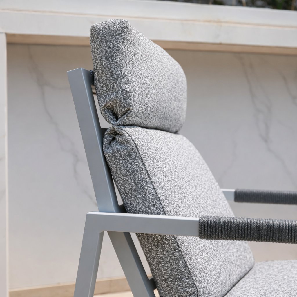 Křesla setu jsou vybavena sedacími a opěrnými polštáři v jemné žíhané světle šedé barvě, která skvěle doplňuje moderní vzhled a nabízí maximální pohodlí. Sedáky jsou snímatelné, což usnadňuje údržbu, zatímco opěrky jsou pevně uchyceny pomocí suchých zipů pro extra stabilitu.