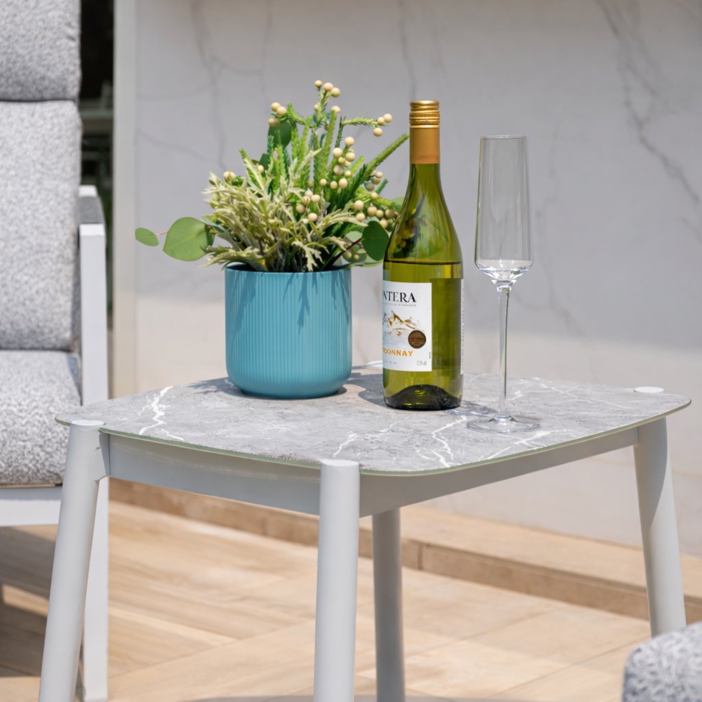 Stůl s deskou z tvrzeného skla s elegantní imitací mramorového povrchu dodává setu nádech luxusu a zároveň je odolný a snadno se čistí.
