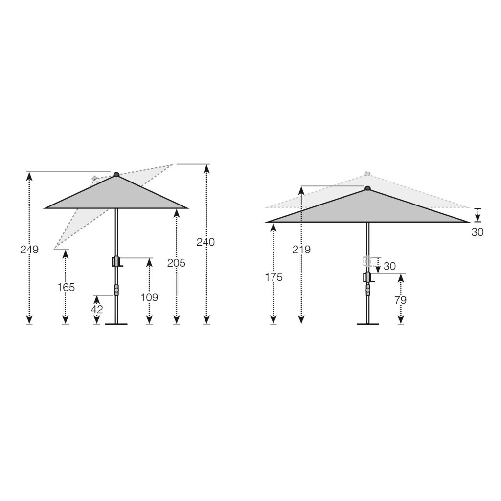 Luxusní zahradní slunečník od prémiové značky Knirps je výškově nastavitelný až o 30 cm a vybavený klikovým mechanismem umožňujícím snadné naklápění. Má lehkou a pevnou hliníkovou konstrukci a kvalitní potah s vysokou ochranou před UV zářením SPF 80. Svými rozměry je ideální na balkón nebo menší terasu.