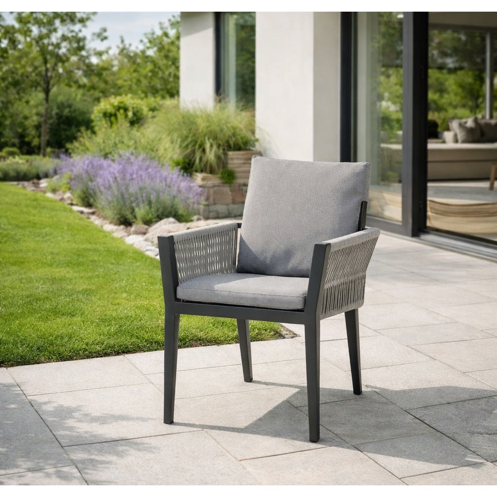 Luxusní zahradní křeslo Namaste má masivní hliníkovou konstrukci v antracitové barvě. Bočnice a opěrná část křesla jsou z pevného, povětrnostním vlivům odolného provazového výpletu. Sedací část je z masivního hliníkového profilu včetně polstru na sedáku i opěradle, s praktickou kapsou přes opěradlo. Díky této kapse polstr pevně drží na křesle, nesjíždí a nekrabatí se.