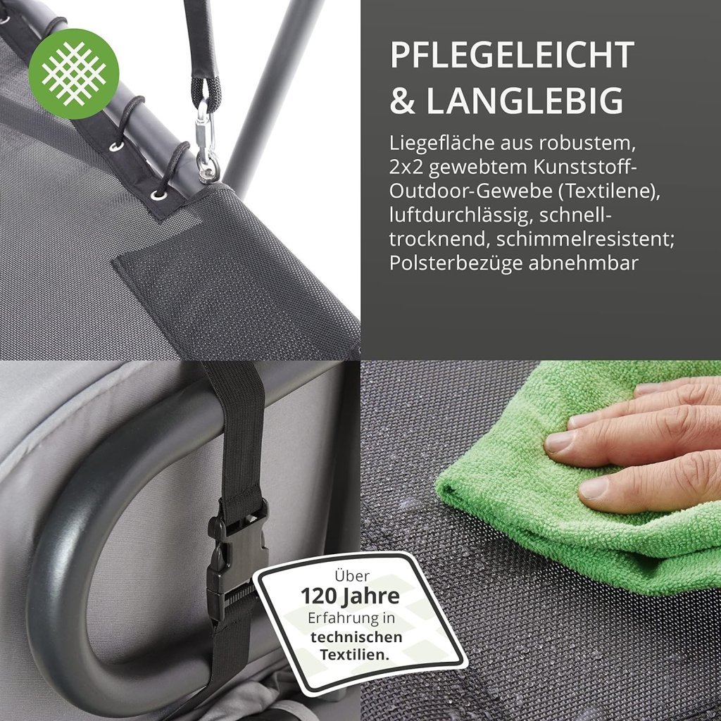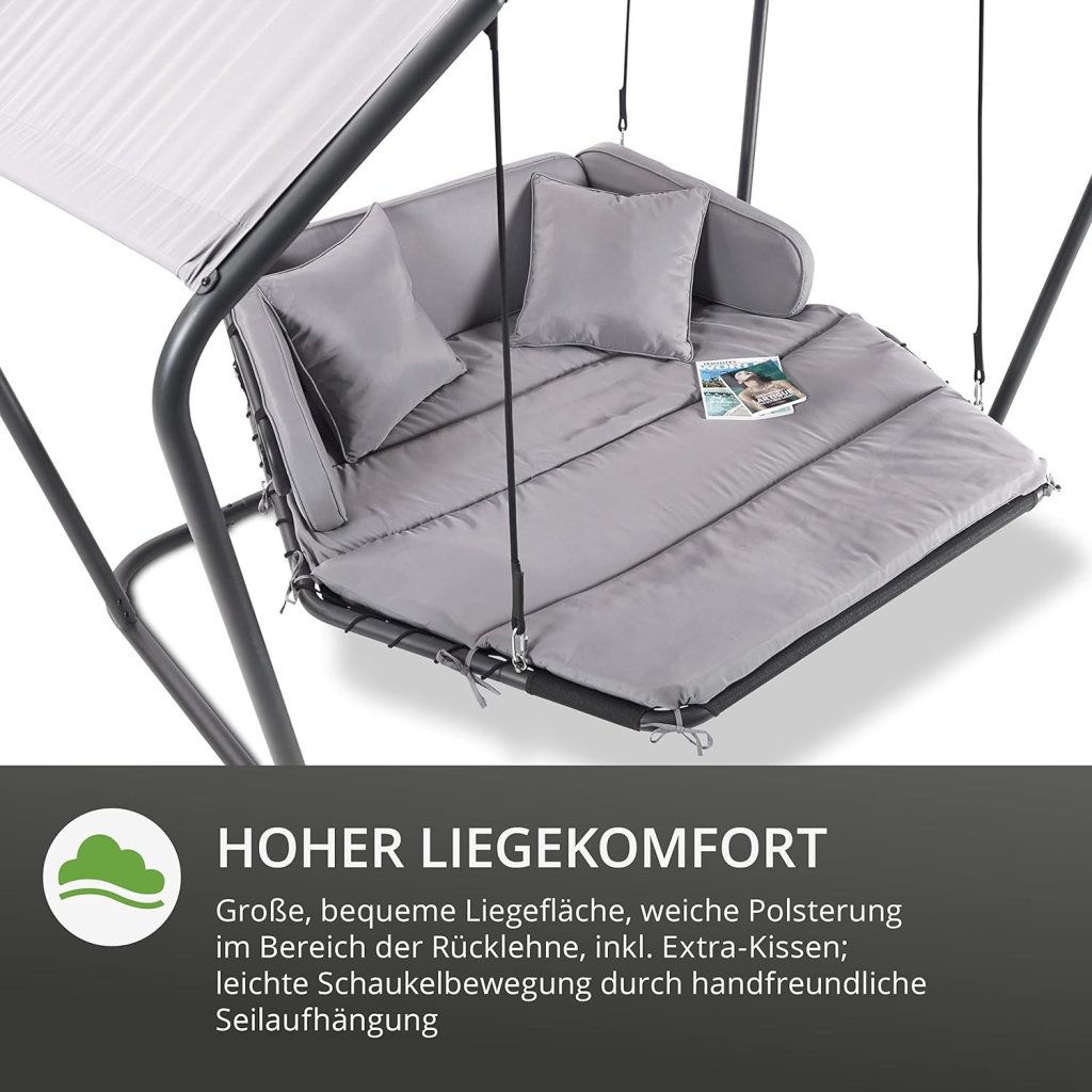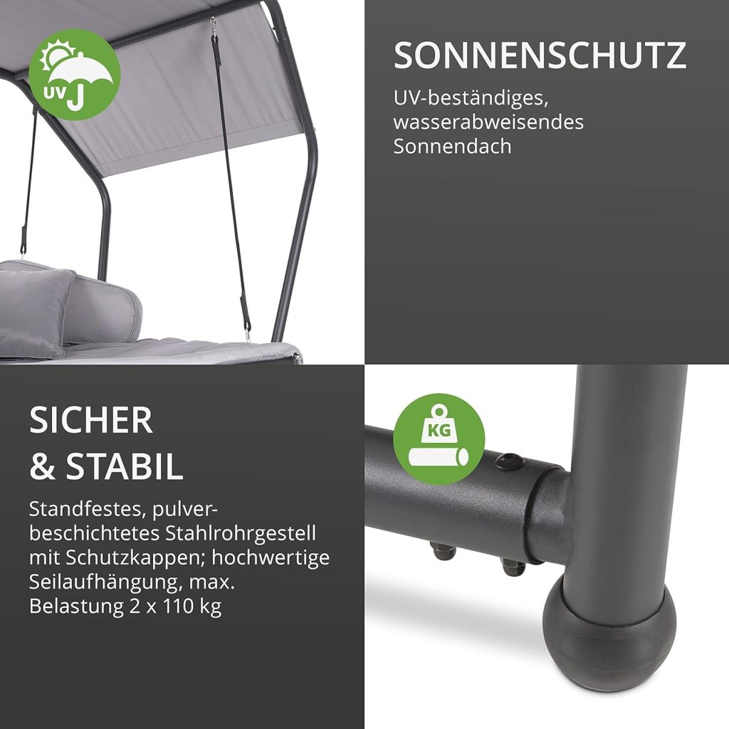 Součástí lehátka jsou čalouněné polštáře a měkká poduška, které vytvářejí pohodlný prostor pro relaxaci ve dvou. Díky vodoodpudivé polyesterové stříšce si užijete příjemný stín i během horkých letních dnů. Materiály použité na čalounění i stříšku jsou navrženy pro dlouhodobé venkovní použití s minimální údržbou.