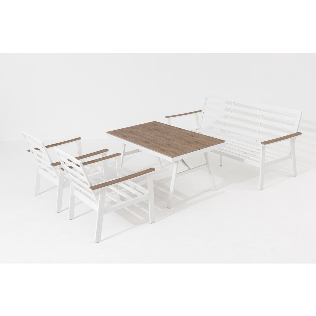 Bílá hliníková konstrukce působí elegantně a doplňují ji šedo-hnědé polstry a prvky v dřevěném dekoru, které celému setu dodávají teplý a přirozený vzhled. Součástí jsou také pohodlné sedáky a opěrky, které zajišťují maximální komfort.
