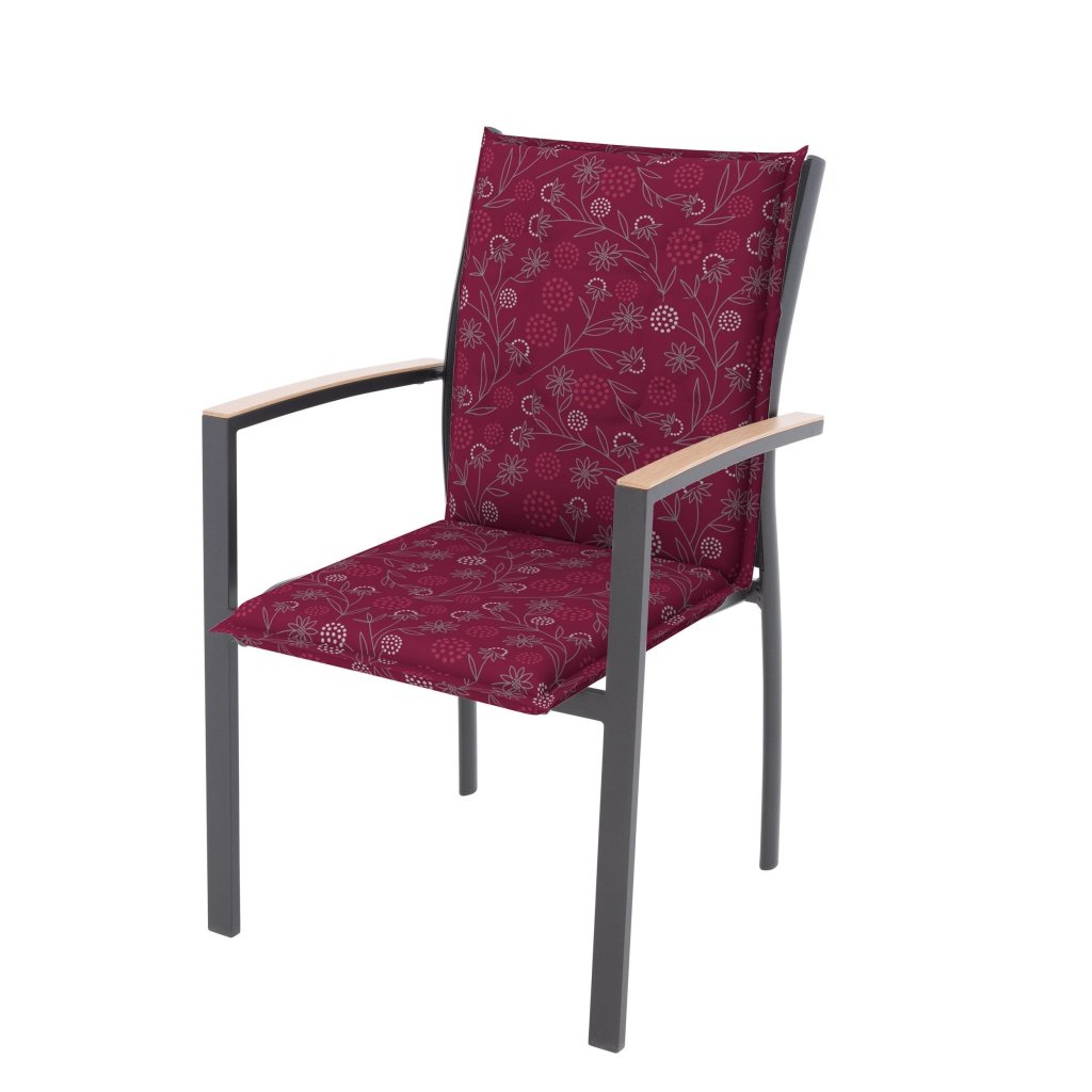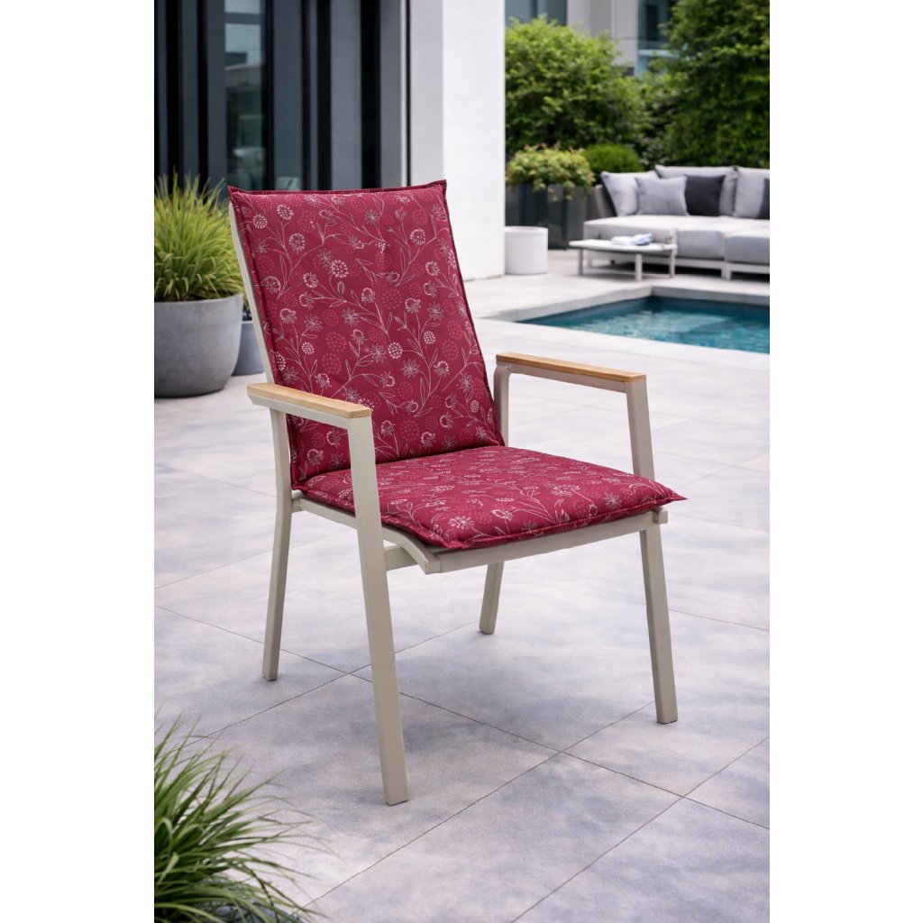 Polstr s nízkou opěrkou na zahradní nábytek řady LIVING je v provedení s obšitým lemem, prošitý kroužkově 2x v opěradle. Uchycení je pomocí posuvné spony. Díky sponě si můžete nastavit velikost dle rozměru a druhu židle, spona je pevná a nevytahuje se. Upevnění sedáku je pomocí dvou tkaniček v ohybu polstru. Síla polstru je optimální pro všechny druhy židlí. Provedení je vhodné i do náročných podmínek kaváren, zahrádek a restaurací. Potah je nesnímatelný.
