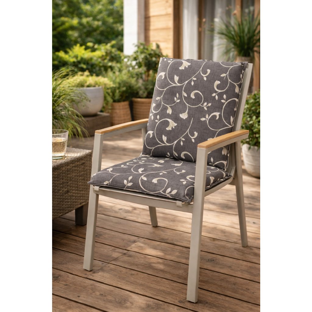 Polstry s nízkou opěrkou na zahradní nábytek řady LIVING jsou v provedení s obšitým lemem, bez prošití v opěradle. Uchycení je pomocí posuvné spony. Díky sponě si můžete nastavit velikost dle rozměru a druhu židle, spona je pevná a nevytahuje se. Upevnění sedáku je pomocí dvou tkaniček v ohybu polstru. Síla polstru je optimální pro všechny druhy židlí. Provedení je vhodné i do náročných podmínek kaváren, zahrádek a restaurací. Polstry jsou v provedení se zipem, potah je snímatelný a je ho možno prát.