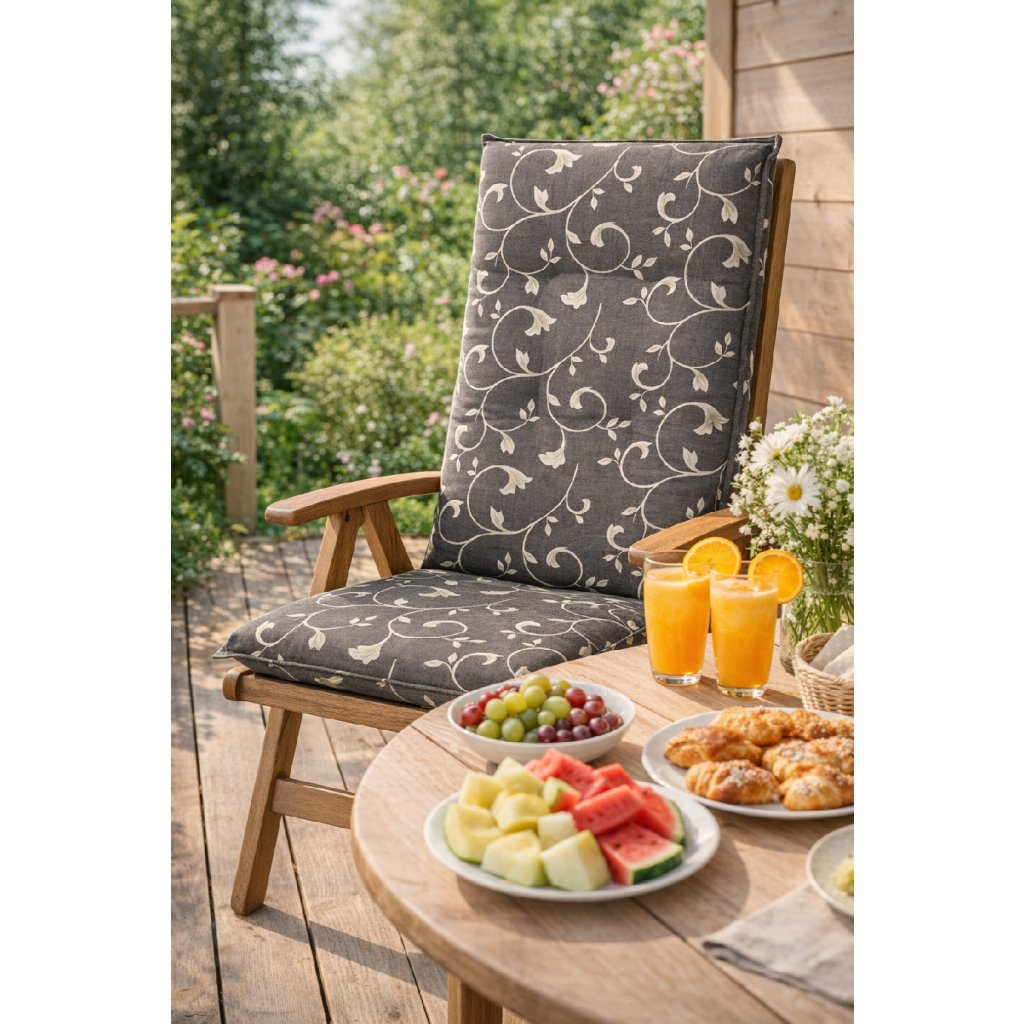 Polstr s vysokou opěrkou na zahradní nábytek řady LIVING je v provedení s obšitým lemem, bez prošití v opěradle. Uchycení je pomocí posuvné spony. Díky sponě si můžete nastavit velikost dle rozměru a druhu židle, spona je pevná a nevytahuje se. Upevnění sedáku je pomocí dvou tkaniček v ohybu polstru. Síla polstru je optimální pro všechny druhy židlí. Provedení je vhodné i do náročných podmínek kaváren, zahrádek a restaurací. Polstr je v provedení se zipem, potah je snímatelný a je ho možno prát.
