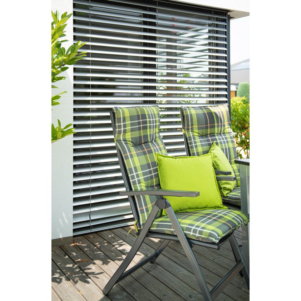 Polstr na zahradní lehátko řady LIVING je v provedení s obšitým lemem, 4x kroužkově prošitý v opěradle. Uchycení je pomocí posuvné spony. Díky sponě si můžete nastavit velikost dle rozměru a druhu židle, spona je pevná a nevytahuje se. Upevnění sedáku je pomocí dvou tkaniček v ohybu polstru. Potah je nesnímatelný. Síla polstru je optimální pro všechny druhy židlí. Provedení je vhodné i do náročných podmínek kaváren, zahrádek a restaurací.