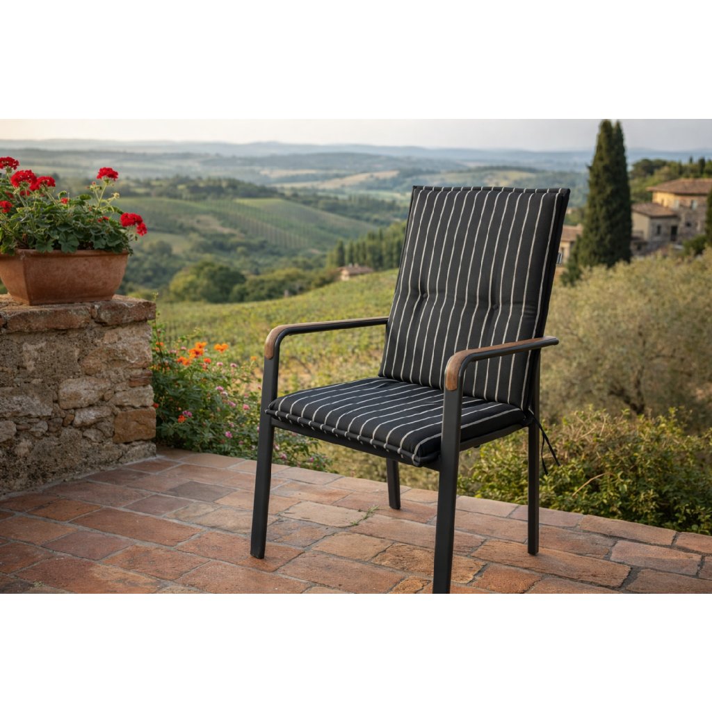 Polstr s nízkou opěrkou řady LIVING je v provedení s obšitým lemem, prošitý kroužkově 2x v opěradle. Uchycení je pomocí posuvné spony. Díky sponě si můžete nastavit velikost dle rozměru a druhu židle, spona je pevná a nevytahuje se. Upevnění sedáku je pomocí dvou tkaniček v ohybu polstru. Síla polstru je optimální pro všechny druhy židlí. Provedení je vhodné i do náročných podmínek kaváren, zahrádek a restaurací. Potah je nesnímatelný.