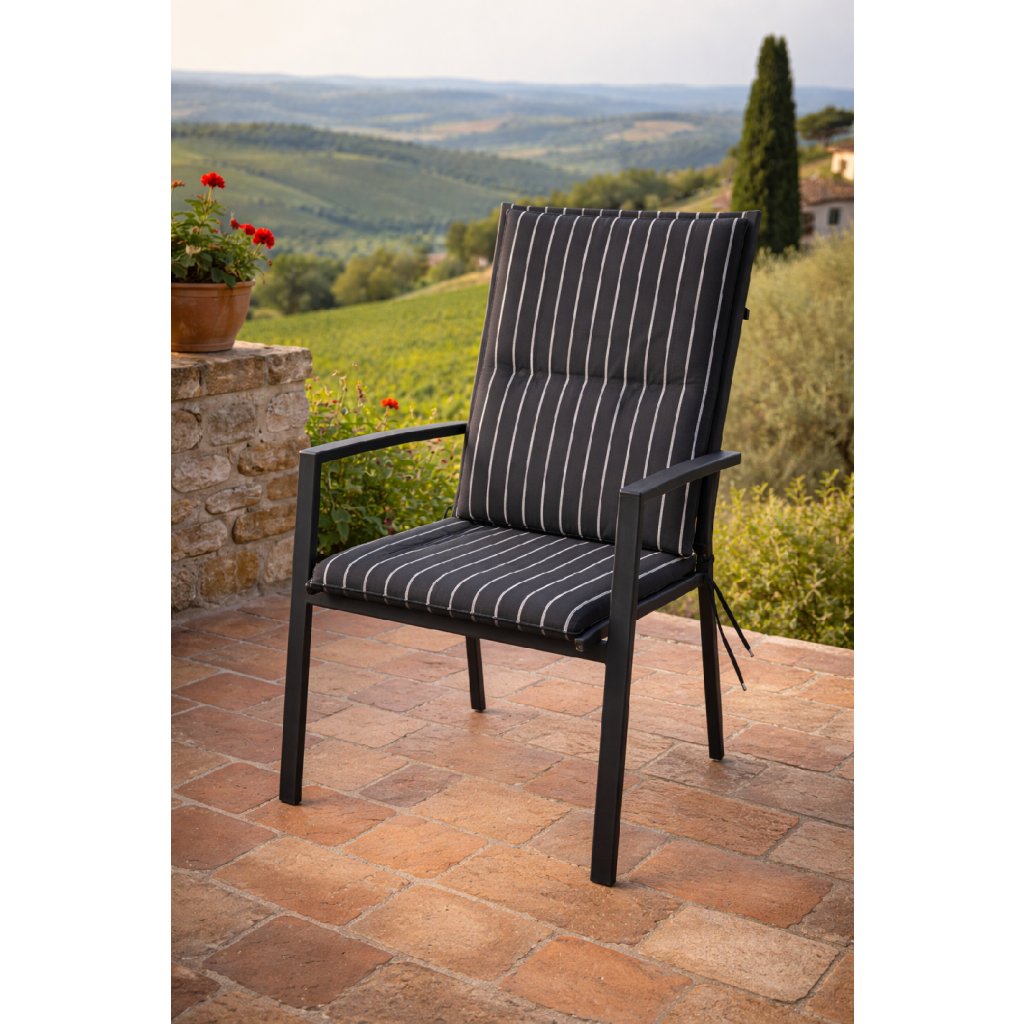 Polstr se střední opěrkou řady LIVING je v provedení s obšitým lemem, prošitý kroužkově 2x v opěradle. Uchycení je pomocí posuvné spony. Díky sponě si můžete nastavit velikost dle rozměru a druhu židle, spona je pevná a nevytahuje se. Upevnění sedáku je pomocí dvou tkaniček v ohybu polstru. Síla polstru je optimální pro všechny druhy židlí. Provedení je vhodné i do náročných podmínek kaváren, zahrádek a restaurací. Potah je nesnímatelný.