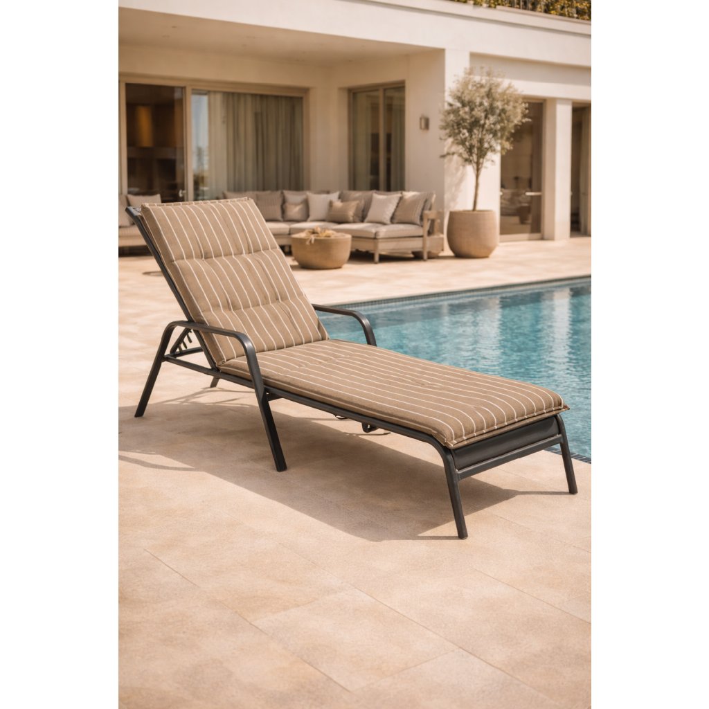 Polstr na zahradní lehátko řady LIVING je v provedení s obšitým lemem, prošitý kroužkově 4x v opěradle. Uchycení je pomocí posuvné spony. Díky sponě si můžete nastavit velikost dle rozměru a druhu židle, spona je pevná a nevytahuje se. Upevnění sedáku je pomocí dvou tkaniček v ohybu polstru. Síla polstru je optimální pro všechny druhy židlí. Provedení je vhodné i do náročných podmínek kaváren, zahrádek a restaurací. Potah je nesnímatelný.