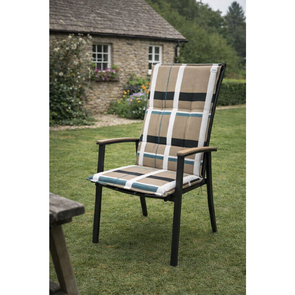 Polstr se střední opěrkou řady LIVING je v provedení s obšitým lemem, prošitý kroužkově 2x v opěradle. Uchycení je pomocí posuvné spony. Díky sponě si můžete nastavit velikost dle rozměru a druhu židle, spona je pevná a nevytahuje se. Upevnění sedáku je pomocí dvou tkaniček v ohybu polstru. Síla polstru je optimální pro všechny druhy židlí. Provedení je vhodné i do náročných podmínek kaváren, zahrádek a restaurací. Potah je nesnímatelný.