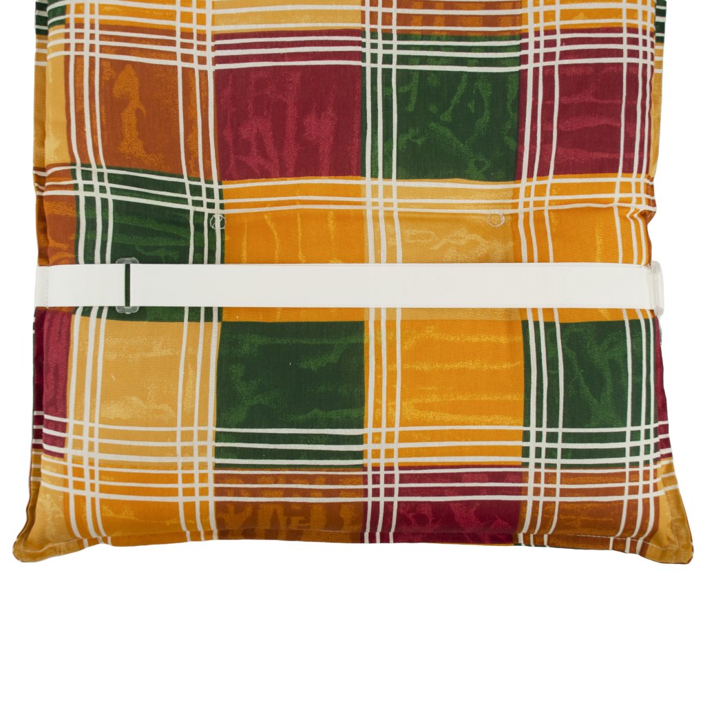 Polstr s vysokou opěrkou řady LIVING je v provedení s obšitým lemem, prošitý kroužkově 4x v opěradle. Uchycení je pomocí posuvné spony. Díky sponě si můžete nastavit velikost dle rozměru a druhu židle, spona je pevná a nevytahuje se. Upevnění sedáku je pomocí dvou tkaniček v ohybu polstru. Potah je nesnímatelný.