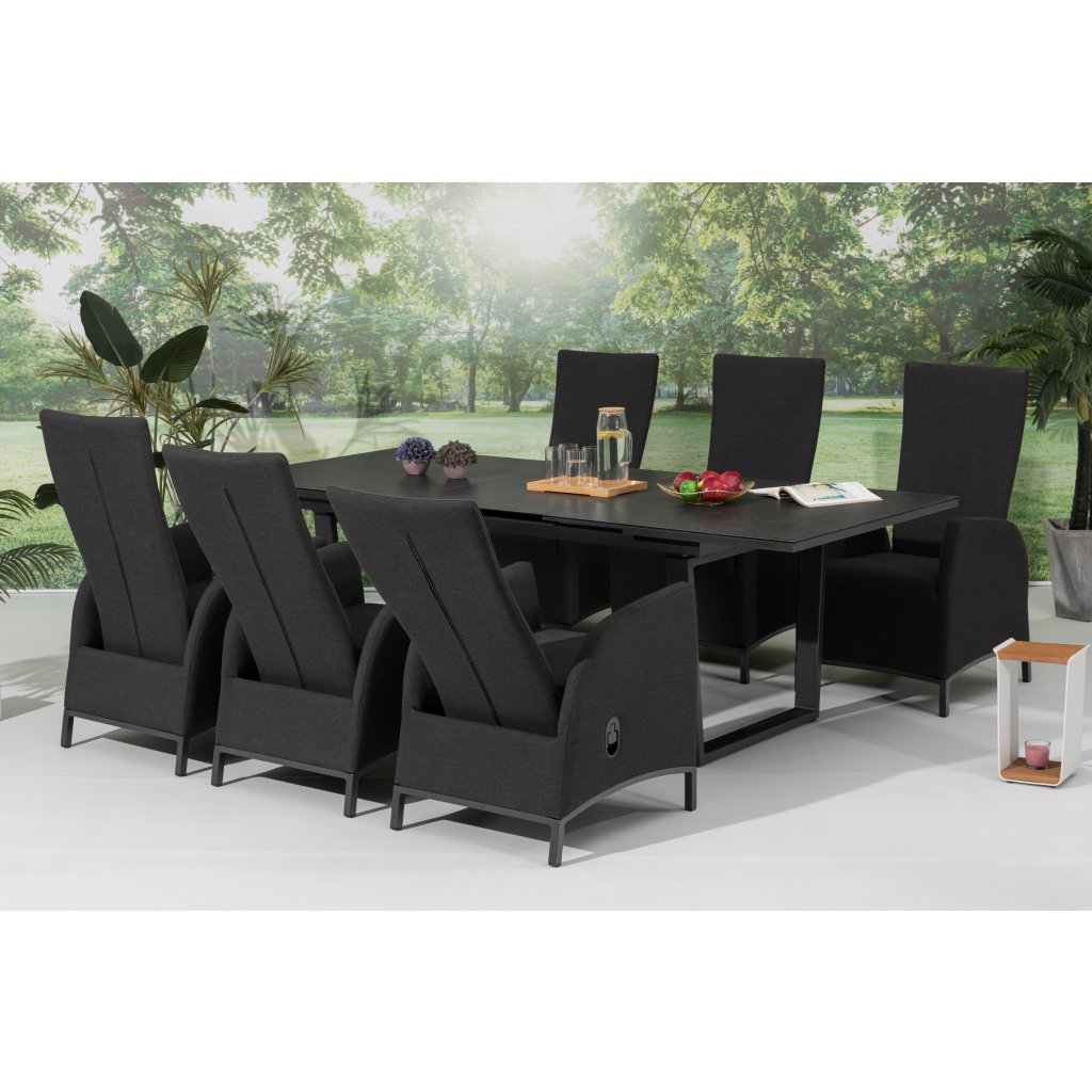 Tato luxusní souprava je vhodná pro každého, kdo hledá elegantní nábytek s mimořádnou odolností vůči nepřízni počasí. Sestava se skládá ze 6 polohovacích křesel a rozkládacího stolu o rozměrech 180/240 x 100 cm.